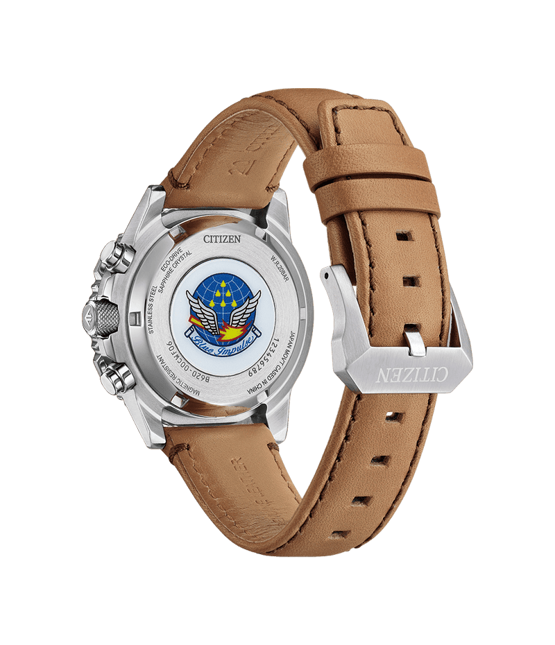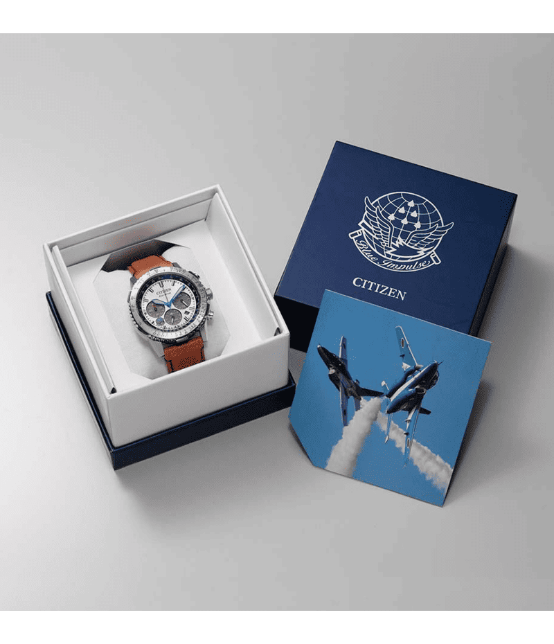 ブルーインパルスのチームカラーを想起させるブルーとシルバーの配色が、力強さと爽やかさを感じさせます。文字板と裏ぶたに、ブルーインパルスのエンブレムをレイアウト。専用ボックスの中には、ブルーインパルスの現行機種T-4の飛行シーンを印刷したカードが入っています。