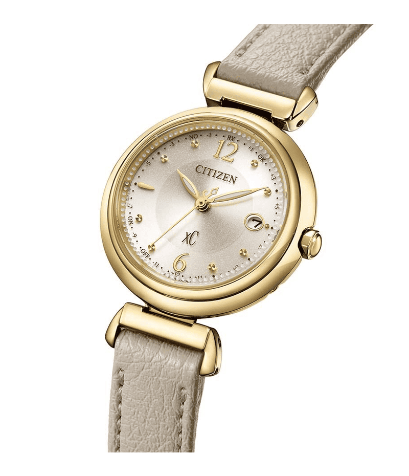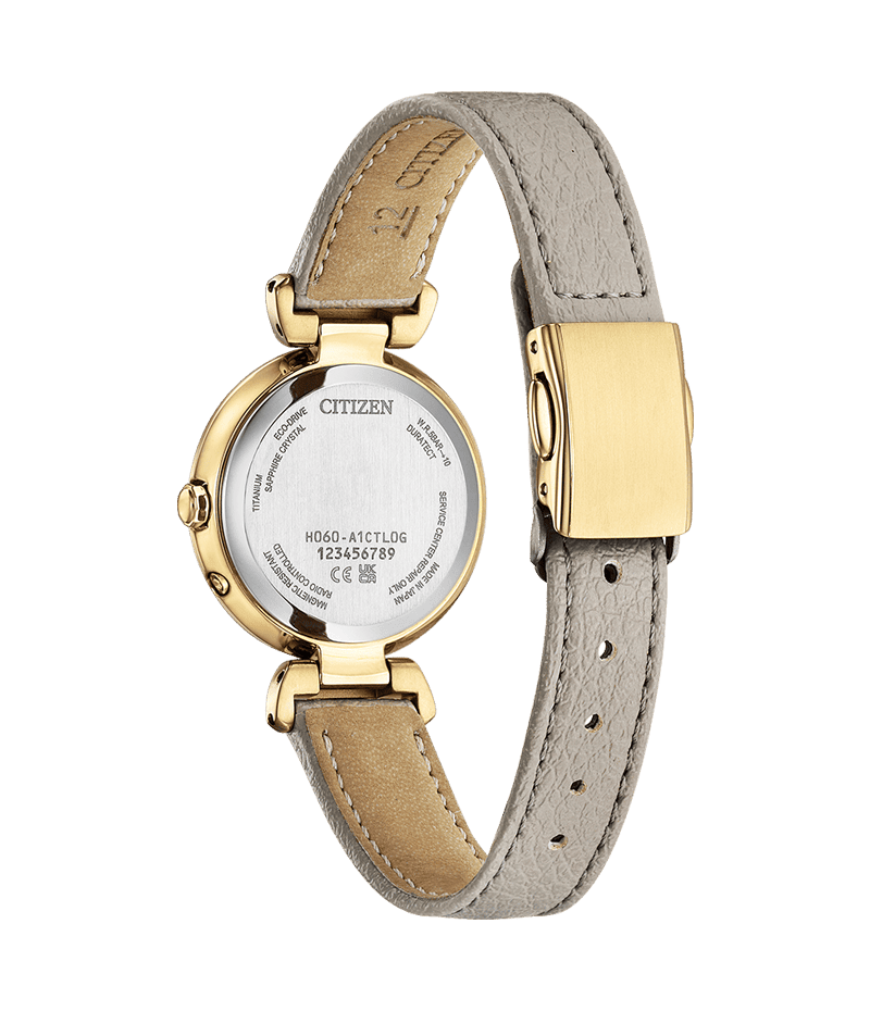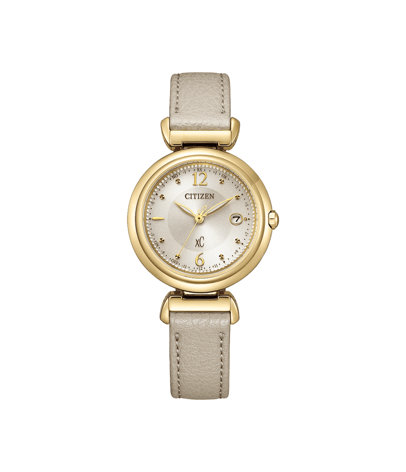 落ち着きのあるアンバーイエローのケースに、ライトベージュの文字板とグレージュのバンドを組み合わせ、カジュアルな印象の中にも洗練された大人っぽさを感じさせるデザインです。バンドには、肌なじみの良い植物(リンゴ)由来の素材を使用し、本革のような質感に仕上げています。