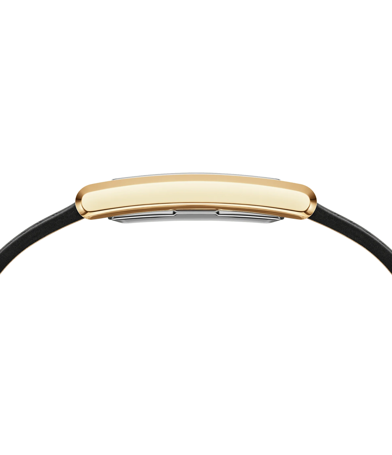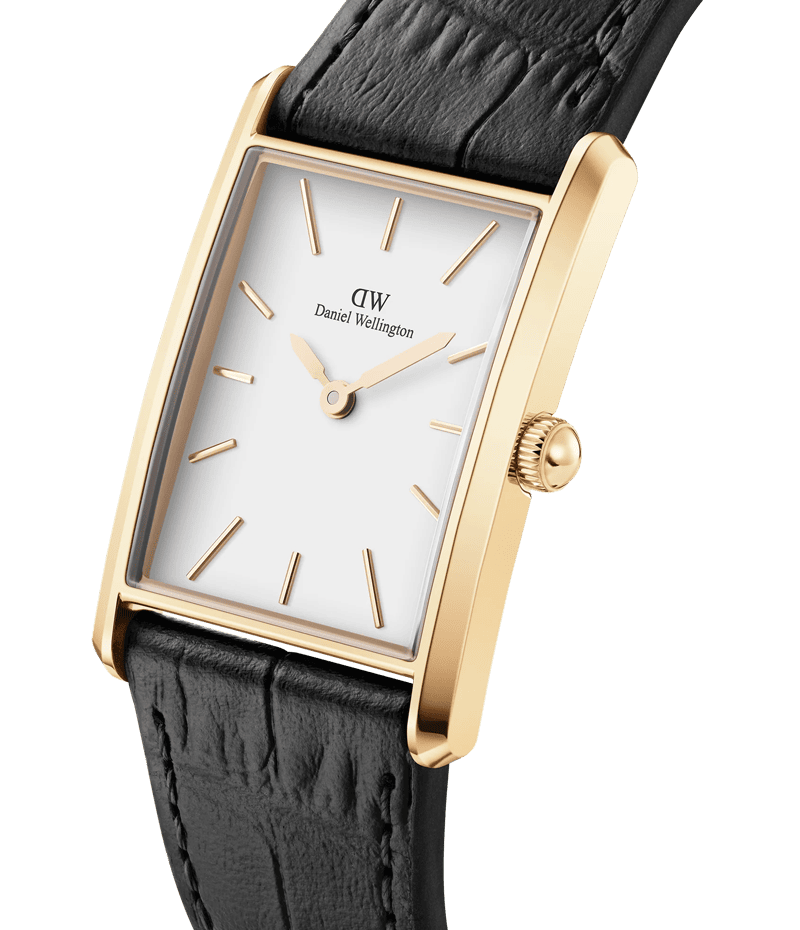 Bound コレクションの洗練された形状と 2 つのサイズで、完璧なシンメトリーの美しさをお楽しみください。 このゴールド時計の湾曲した長方形のケース幅は、クロコダイル模様の黒いレザーストラップとまったく同じ幅で、文字盤と完璧に調和しています。