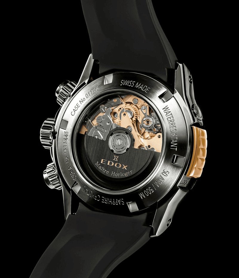 腕に沿うように設計されたラグ、エッジの効いたシャープなフォルム、ラグジュアリースポーツウォッチと呼ぶにふさわしい装飾が施されています。また、サファイアクリスタル製のケースバックを採用し、自動巻きムーブメントの動きを鑑賞することができます。