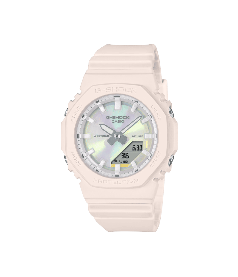 小さなサイズとシンプルなルックスが特徴のGMA-P2100シリーズ。 陽射しを浴びてキラキラと輝く夏の海の情景を、見る角度で表情を変える偏光カラーのダイアルで表現しました。