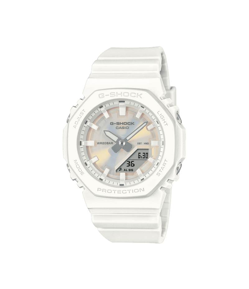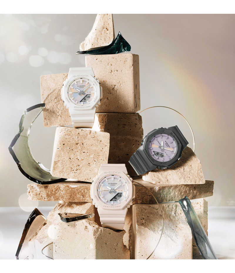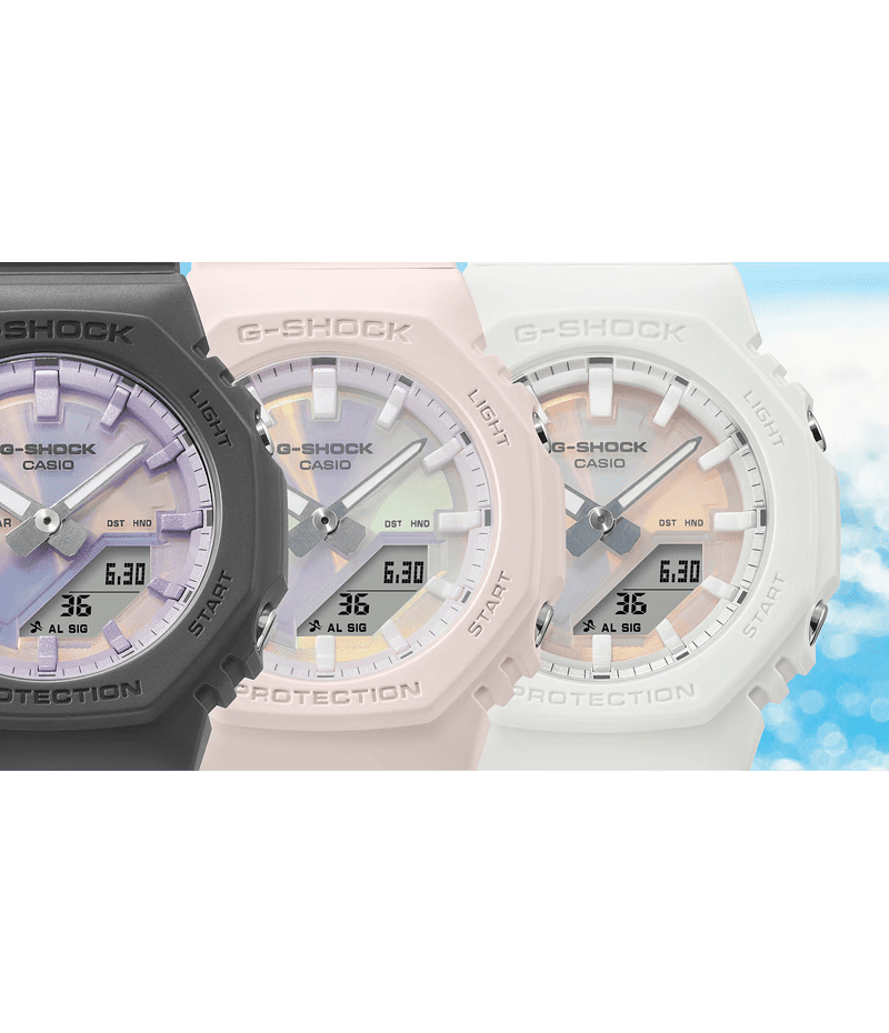 小さなサイズとシンプルなルックスが特徴のGMA-P2100シリーズ。 陽射しを浴びてキラキラと輝く夏の海の情景を、見る角度で表情を変える偏光カラーのダイアルで表現しました。