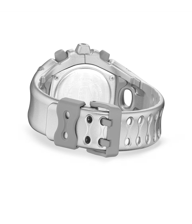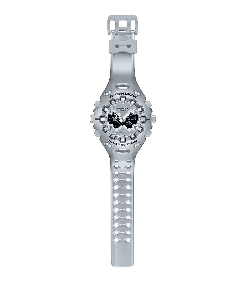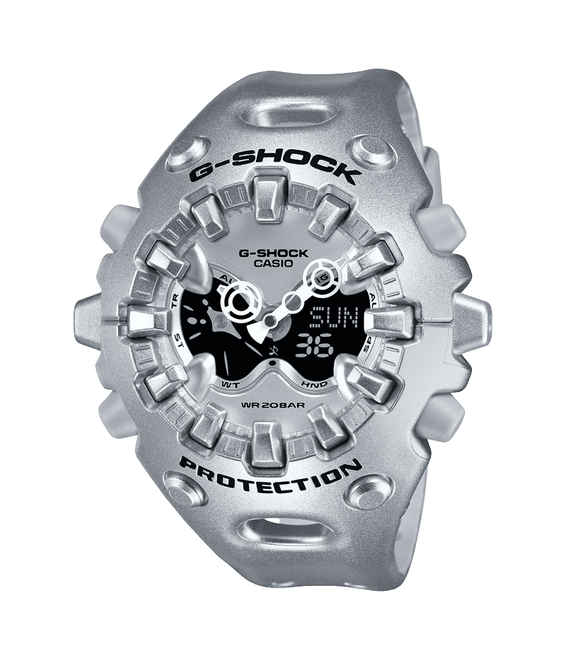 エッジの効いたパーツを組み合わせた有機的な外装フォルム、2つの穴が大きな特徴となっているショックリリース針など常識を覆す斬新な発想で、強さを求めて挑戦を続けるG-SHOCKのアイデンティティを形にしました。
