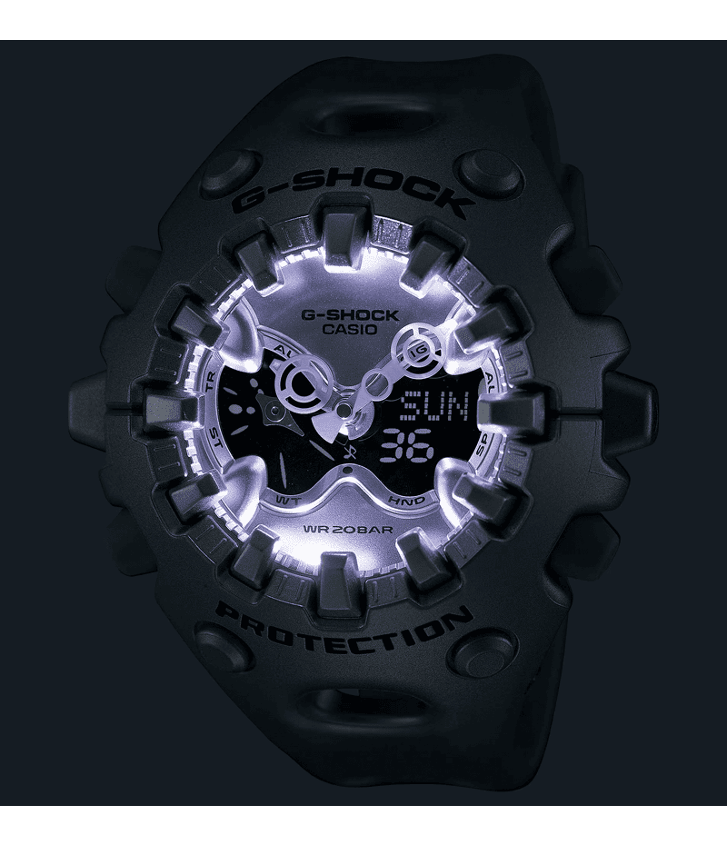 モジュールを保護するセンターケースを、ベゼル・バンド一体構造の外装パーツでカバー。大型の立体インデックスをガラス上面に配置することで、衝撃を緩和するバンパーの役割を持たせました。G-SHOCK独自の耐衝撃性能をキープしながら、ユニークかつ力強い外装デザインを実現しています。