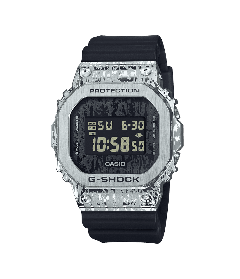 タフネスを追求し進化を続けるG-SHOCKから、グランジファッションにインスパイアされた、GRUNGE CAMOUFLAGE Seriesです。 90年代に登場したグランジファッションからインスピレーションを受け、メタルベゼルには特別な加工で金属が剥がれ落ちたような模様を配し、グランジファッションのカッコよさを表現しました。