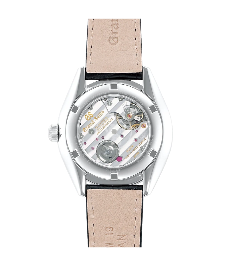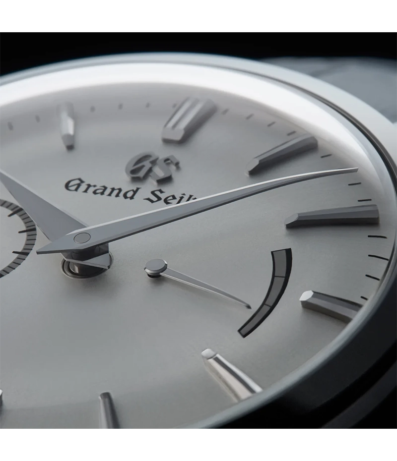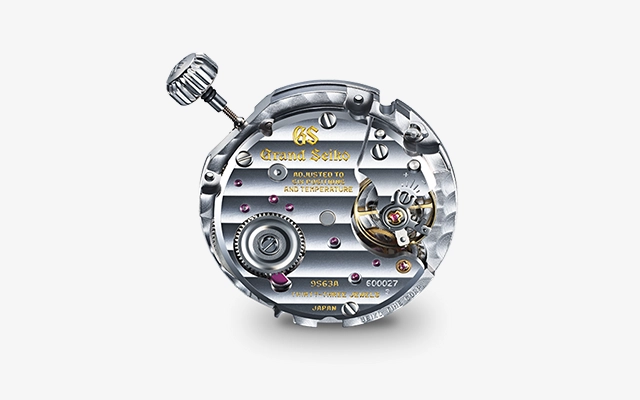 手巻メカニカルムーブメント、キャリバー9S63は、グランドセイコー初の小秒針を搭載したムーブメントです。9時位置に小秒針、3時位置にパワーリザーブインジケーターを配し、腕時計と対話するかのように、パワーリザーブ針を確認しながら、ぜんまいを巻き上げることができます。