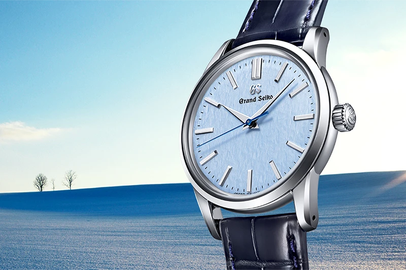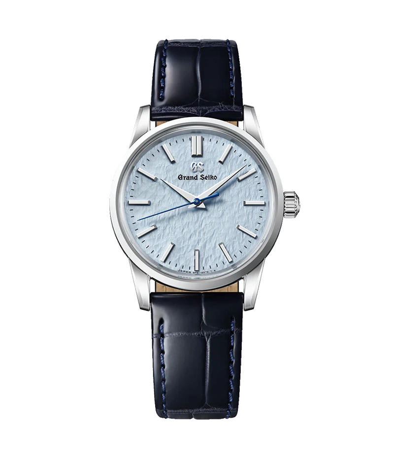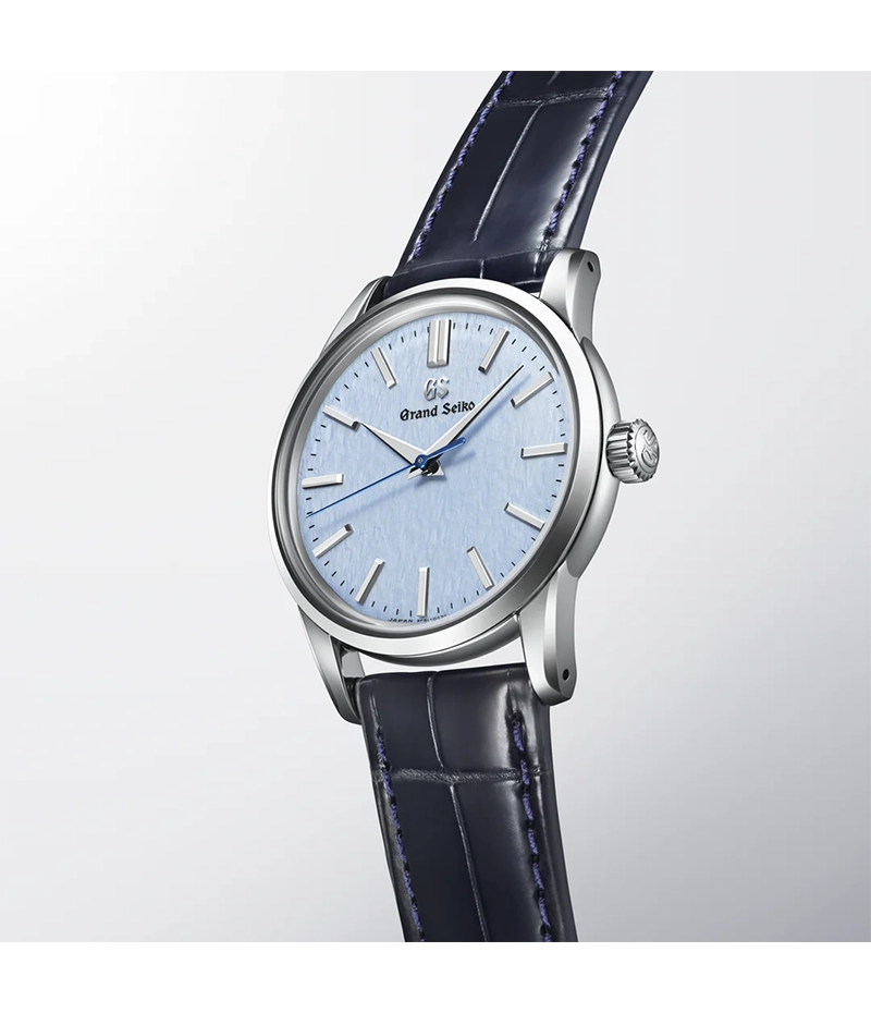 風紋の刻まれた雪のような独特なダイヤル模様は、信州の山々に積もった雪から着想を得たもので、このダイヤルを採用したモデルは世界中から人気を博しています。その和紙のような繊細な質感のダイヤルに、水色のカラーリングを施したモデルです。