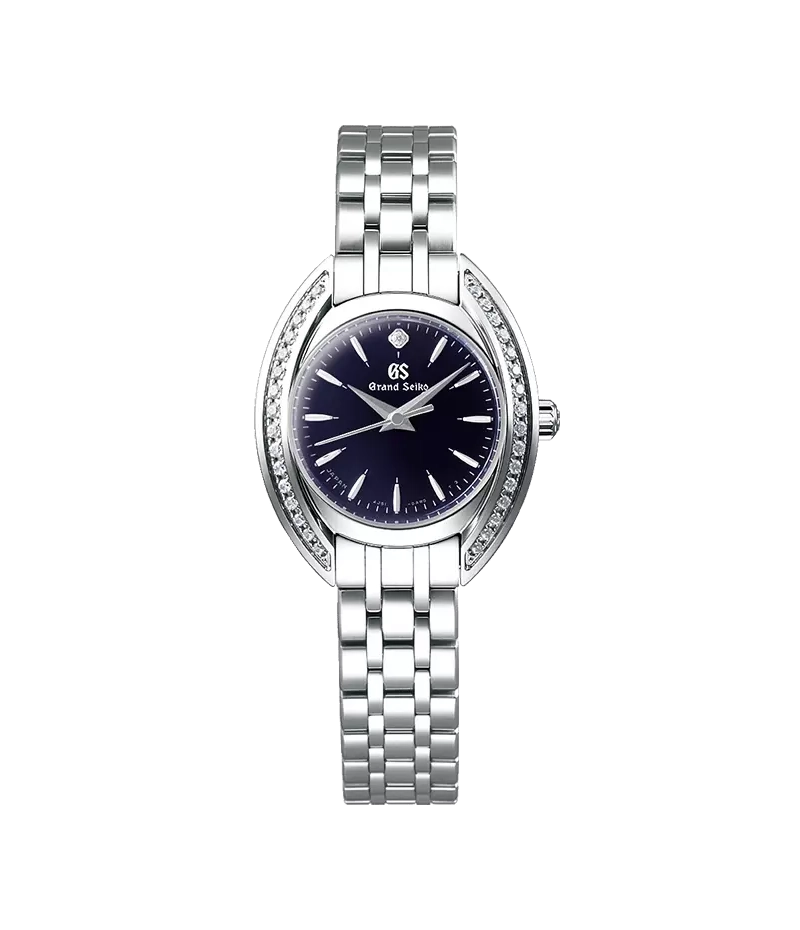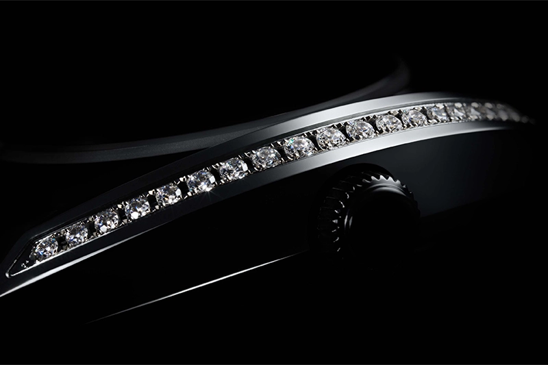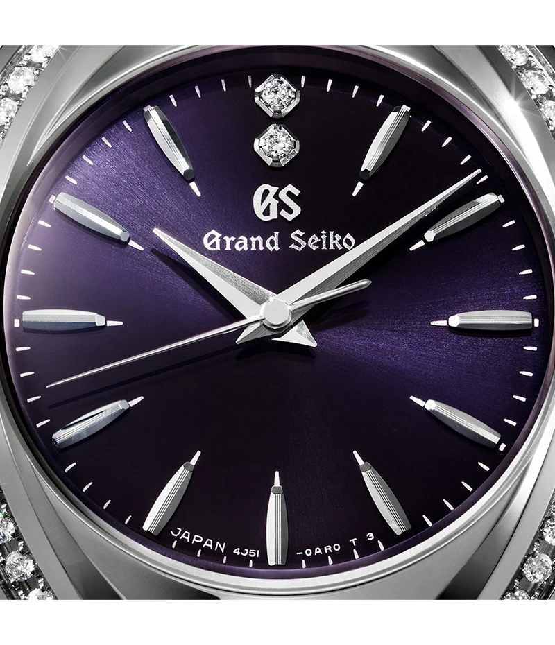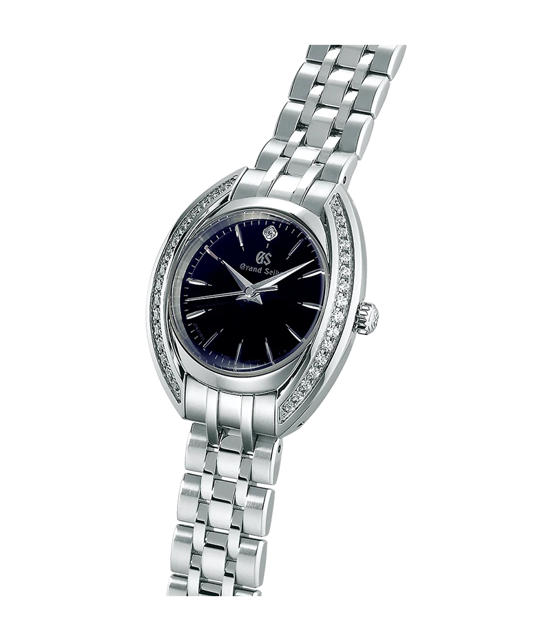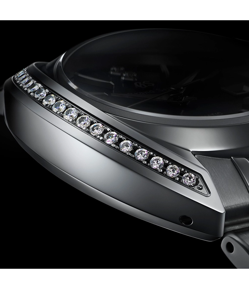 このモデルを象徴するのは、ガラスサイドの大きなアーチにダイヤモンドをセッティングしている華やかなポイント。トップを揃えながら複数のサイズの石を組み合わせて立体的にセッティングすることで、あらゆる角度の光を取り込み、流れるような美しい輝きを放ちます。ダイヤモンドの回りのケース部分にグランドセイコーならではの研磨を施し、歪みない金属の鏡面とシャープなラインがダイヤモンドと完璧に調和します。熟練した職人による匠の技で、貴石を傷つけず平滑に磨き上げています。