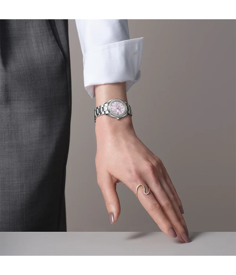 またダイヤカットを施した針やインデックスの煌めきは、美しさと視認性を共存させたデザインで、どんな装いにも合わせやすく、エレガントな時を演出してくれます。