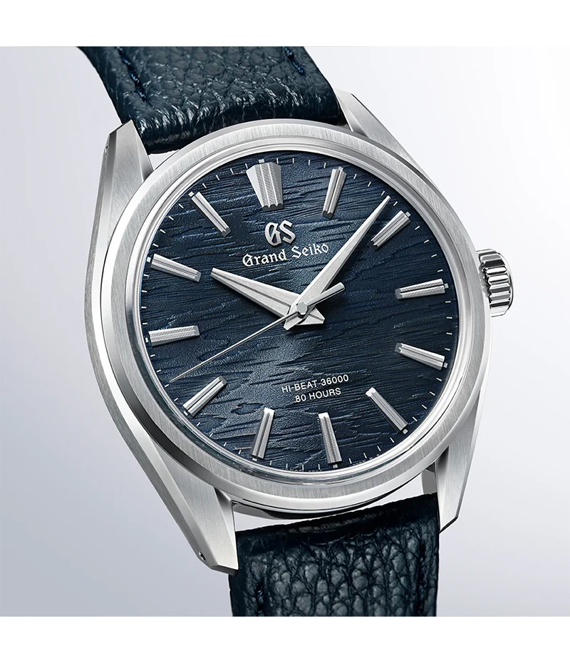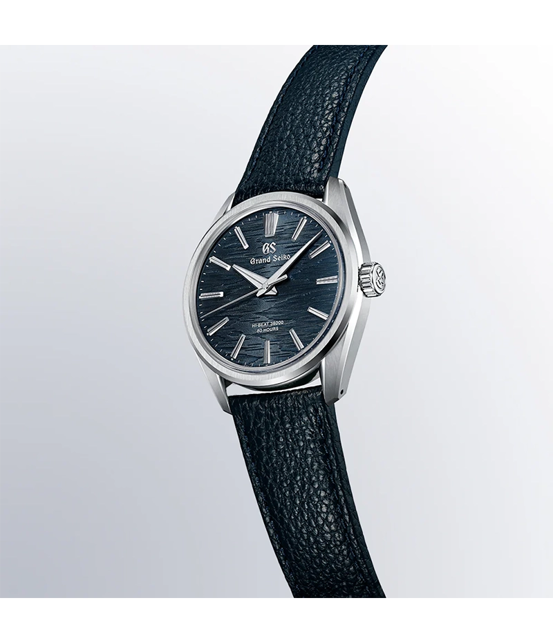 ステンレススチール製のケースは厚さ9.95mmと薄型に仕上げ、すっきりとしたインデックスやベゼル、ラグの幅が、グランドセイコーのドレスウオッチにふさわしい繊細で優美なる存在感を演出。柔らかな感触と美しくシュリンクしたシボの風合いのストラップを採用し、ダイヤルと調和するカラーリングで、月明りに照らされる白樺林の情景を描き出します。
