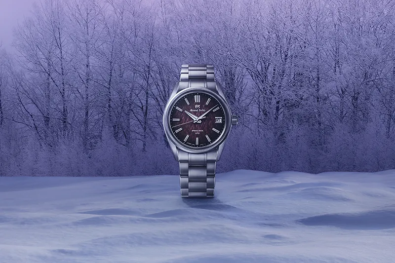 「信州 時の匠工房」の東に位置する諏訪・霧ヶ峰高原では、冬の深まりとともに樹々が氷の衣をまとい、幻想的な「樹氷」の世界が広がります。本作のダイヤルには、その凛とした自然の美しさを、精緻な型打模様で描きだしました。さらに、樹氷の森が静かに目覚める夜明けの神秘的な情景を、バイオレットカラーの繊細なグラデーションで表現しました。