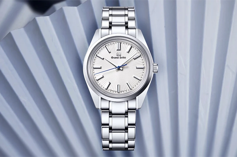 44GSで完成したデザイン文法「グランドセイコースタイル」は、「障子」や「屏風」「扇子」などにみられる直線的な平面をなす和の様式にインスピレーションを得ることでその方向性を決定づけられました。本作のダイヤルは、まるで扇のような平面の連なりで作られる放射模様が施されており、「グランドセイコースタイル」のルーツが感じられるデザインで44GSのケースと調和します。美しい陰影を味わえるホワイトのダイヤル上で、鮮やかなブルースチール秒針が時を刻みます。
