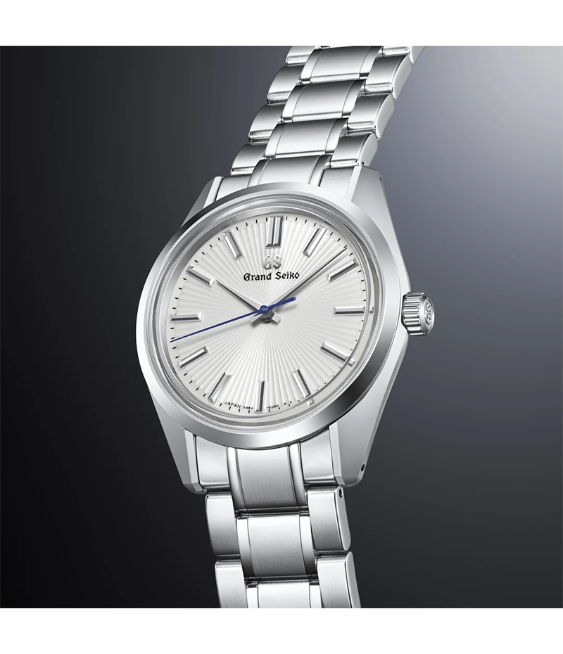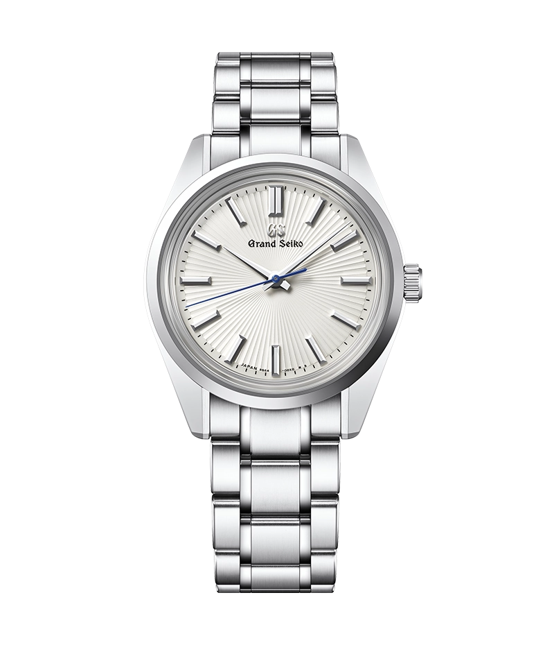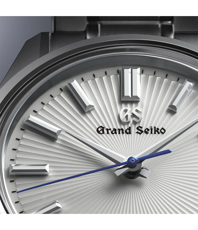 44GSで完成したデザイン文法「グランドセイコースタイル」は、「障子」や「屏風」「扇子」などにみられる直線的な平面をなす和の様式にインスピレーションを得ることでその方向性を決定づけられました。本作のダイヤルは、まるで扇のような平面の連なりで作られる放射模様が施されており、「グランドセイコースタイル」のルーツが感じられるデザインで44GSのケースと調和します。美しい陰影を味わえるホワイトのダイヤル上で、鮮やかなブルースチール秒針が時を刻みます。