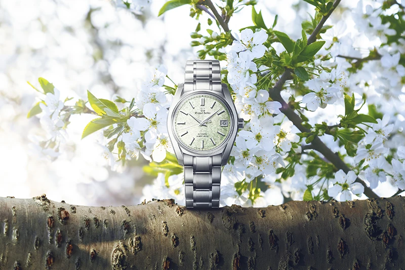 ライトグリーンのダイヤルは、二十四節気の一つである春の「清明」の頃に芽吹く、桜の若葉をイメージ。薄桃色の桜の花びらの合間で陽の光を透かして光る若葉の瑞々しさを表現しました。美しく移り変わる情景の束の間の時を切り取ったダイヤルです。