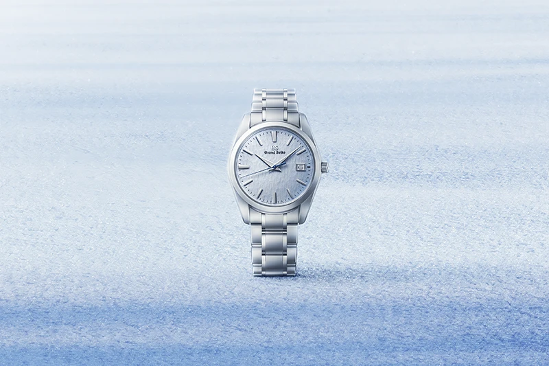 グランドセイコーのクオーツモデルを製造する「信州 時の匠工房」から望む穂高連峰は、冬になると数か月にわたり雪に覆われます。その硬く締まった雪面が強風に削られ、風雪紋が生まれます。この風雪紋を型打ち模様で表現した「雪白パターン」に、雪景色に映る澄んだ冬空の青をイメージしてライトブルーのカラーリングを施しました。そして、ダイヤルの上を流れるように進むブルースチールの秒針が、静かな時の移ろいを表しています。