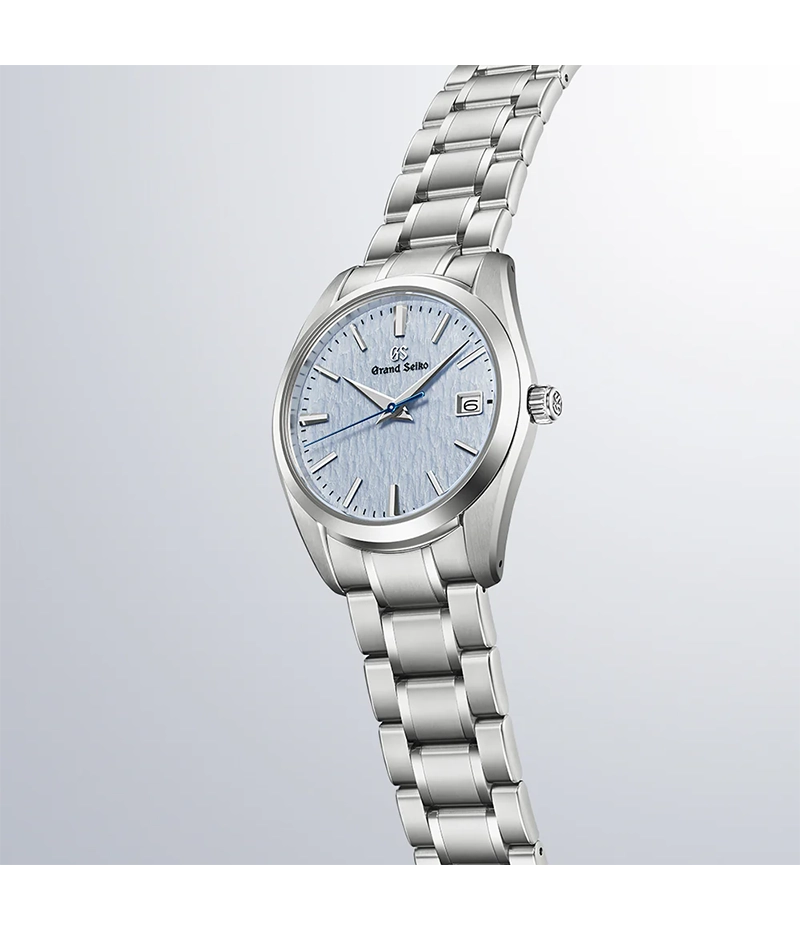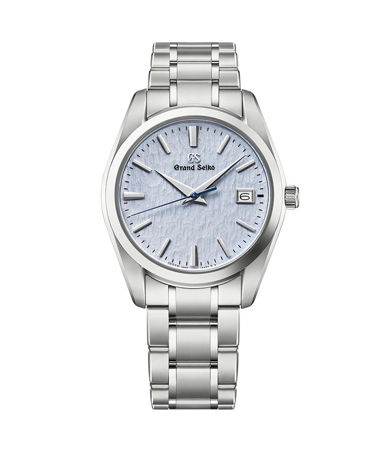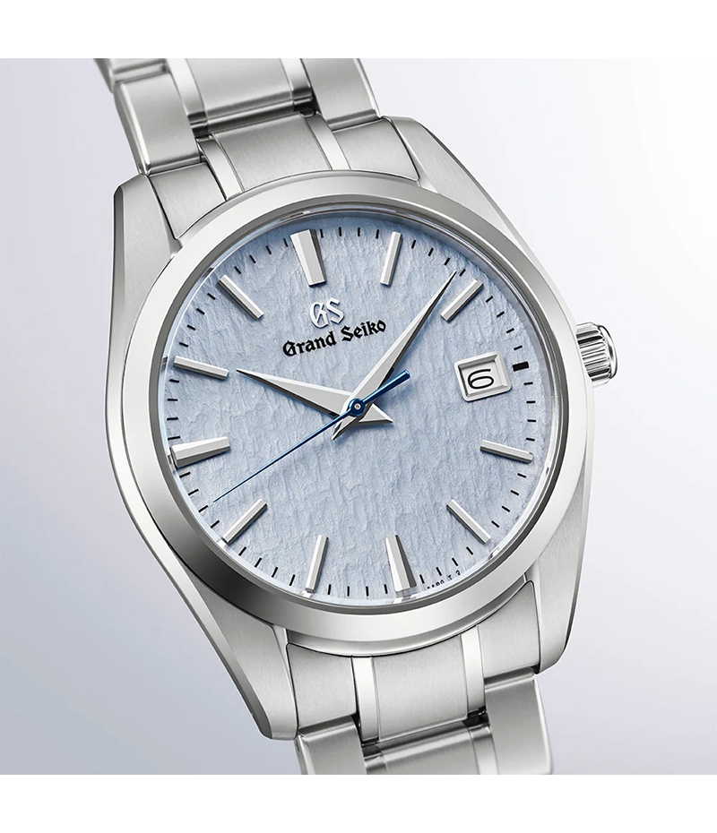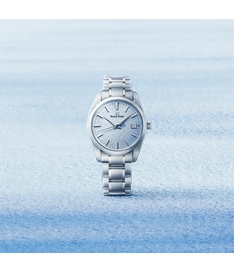 グランドセイコーのクオーツモデルを製造する「信州 時の匠工房」から望む穂高連峰は、冬になると数か月にわたり雪に覆われます。その硬く締まった雪面が強風に削られ、風雪紋が生まれます。この風雪紋を型打ち模様で表現した「雪白パターン」に、雪景色に映る澄んだ冬空の青をイメージしてライトブルーのカラーリングを施しました。そして、ダイヤルの上を流れるように進むブルースチールの秒針が、静かな時の移ろいを表しています。
