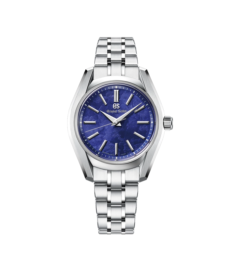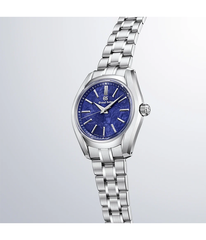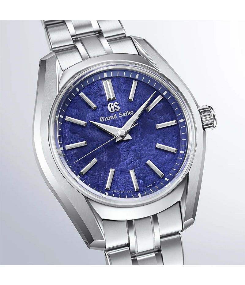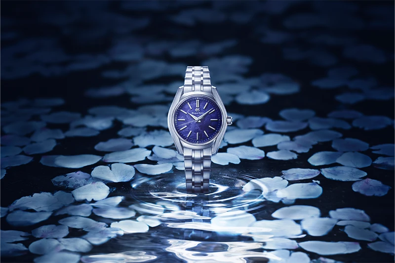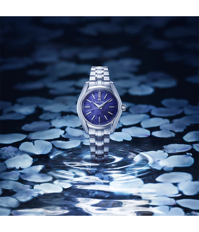 本作は、春分の夜、見ごろを迎えた桜が風に舞い、川に散り積もり流れゆく情景「宵花筏(よいはないかだ)」をモチーフに、桜の花びらが朧月に照らされる幻想的な春の情景を、ブルーのダイヤルで表現しています。「花筏」をモチーフとしたSBGX363と合わせて、日本の春の情景を昼夜二つの時間帯で表現した、グランドセイコーブランドの魅力を堪能できるモデルです。