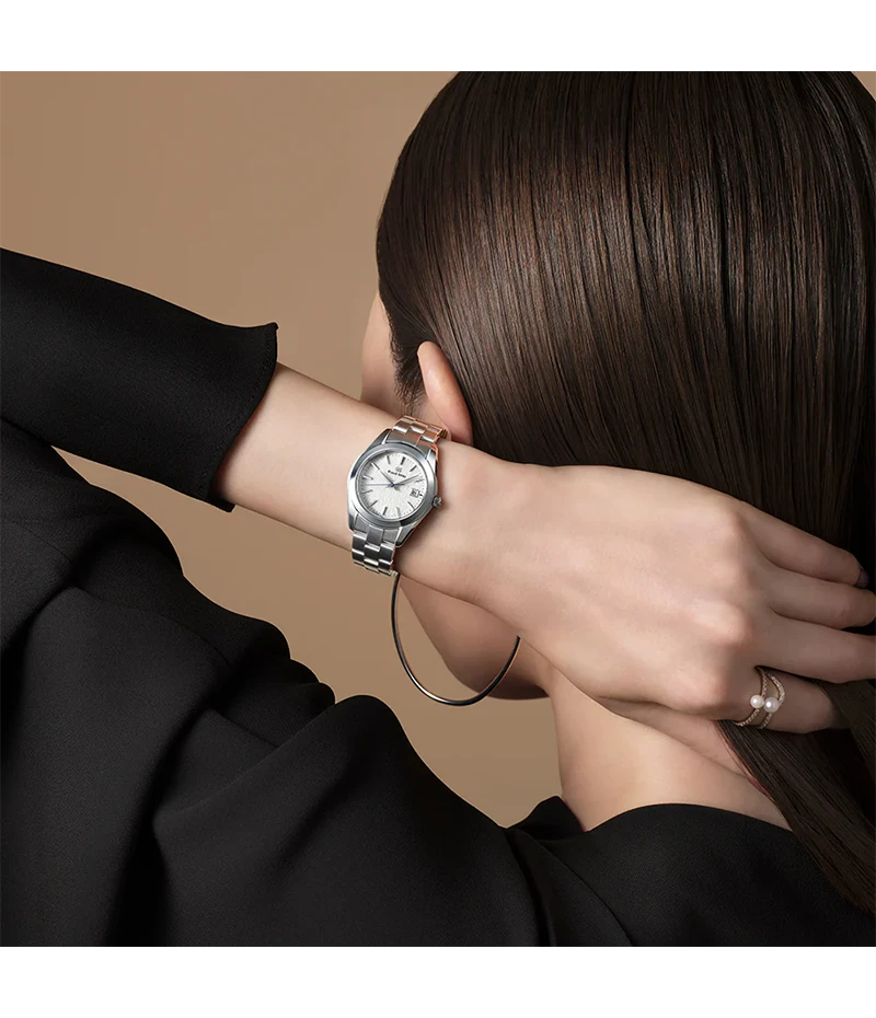 硬さを帯びた雪面が強い風によって削られ生み出される風雪紋は、厳しい冬山で見られる美しい風景のひとつ。グランドセイコーのスプリングドライブモデルとクオーツモデルがつくられる「信州 時の匠工房」から望む穂高連峰は、毎年数ヶ月にも渡って雪に覆われています。冬の時期になるとこの地でもよく目にすることができるその耽美的な風雪紋を、ダイヤルパターンとして再現したのが通称「雪白ダイヤル」です。