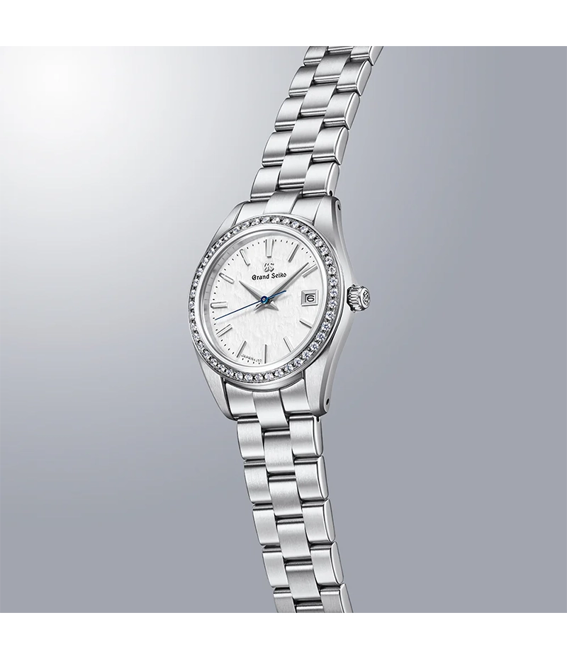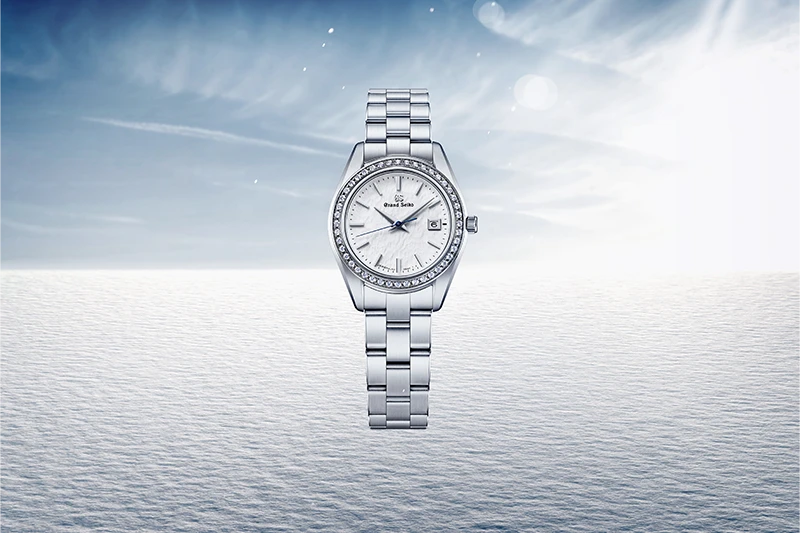 このモデルが製造される「信州 時の匠工房」から望む穂高連峰の荘厳な雪景色が美しく再現された白銀のダイヤル。「雪白」と呼ばれるそのダイヤルは未踏の雪原に風が刻む風雪紋を表現した、グランドセイコーの美学が息づく繊細なダイヤル模様です。ブルースチール秒針の鮮やかな青さと、ベゼルにセッティングされた44個のダイヤモンドの煌めきが、光の当たり加減によって様々な表情を見せてくれます。その上品な輝きは、どんな装いにも合わせやすく、エレガントな時を演出します。