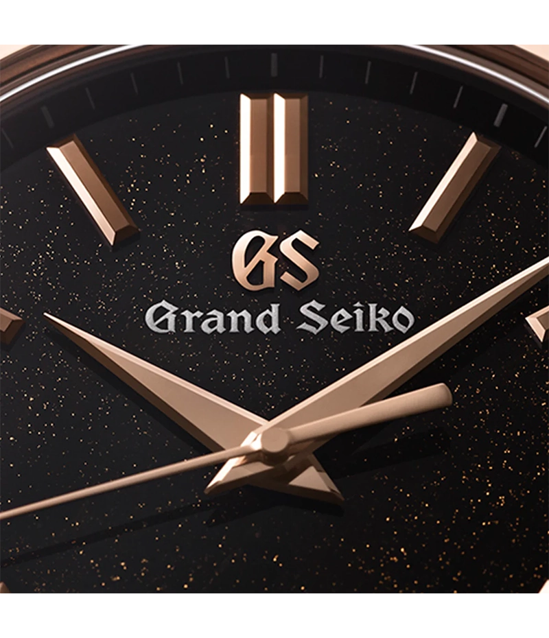 まるで星のような煌めきを放ち、光をダイヤルの奥まで取り込むと、まさに満天の星空のような模様が浮かび上がります。この広々としたダイヤルの上を、グランドセイコーで最も長い分針・秒針が音もなく滑り行く様は、唯一無二の魅力を感じさせてくれます。