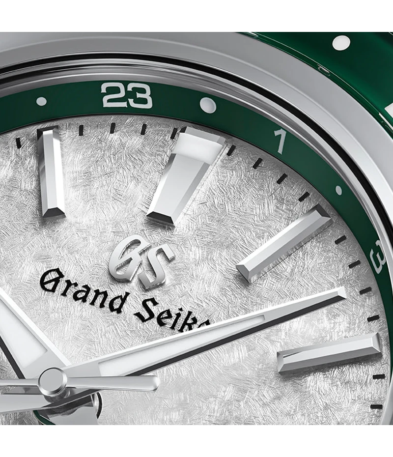 夏になっても雪を残す高山の渓谷は「雪渓」と呼ばれ、夏山の美しい光景として見る人の心を魅了します。本作は、夏山の緑の中にくっきりと浮かび上がるその「雪渓」の雄大さを、回転ベゼルに施されたグリーンと、繊細な型打ちで表現された純白のダイヤルパターンで表現しました。