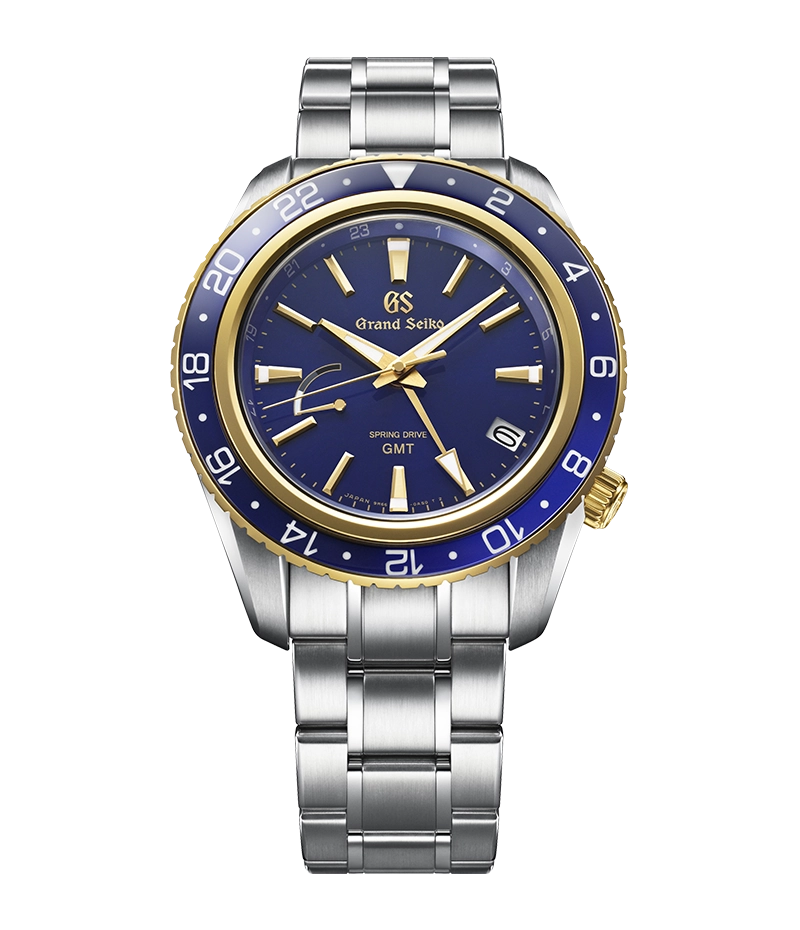 水平線に浮かぶ朝日を思わせるようなブルー×ゴールドのコントラストが、リゾートカジュアルと相性の良いスポーティーなカラーリング。グランドセイコー史上初となる18Kイエローゴールドを用いた回転ベゼルに、りゅうずや中留のGSロゴワッペンにも大胆に採用された18Kイエローゴールドは、従来のスポーツコレクションにはない艶感のあるデザインを実現しています。