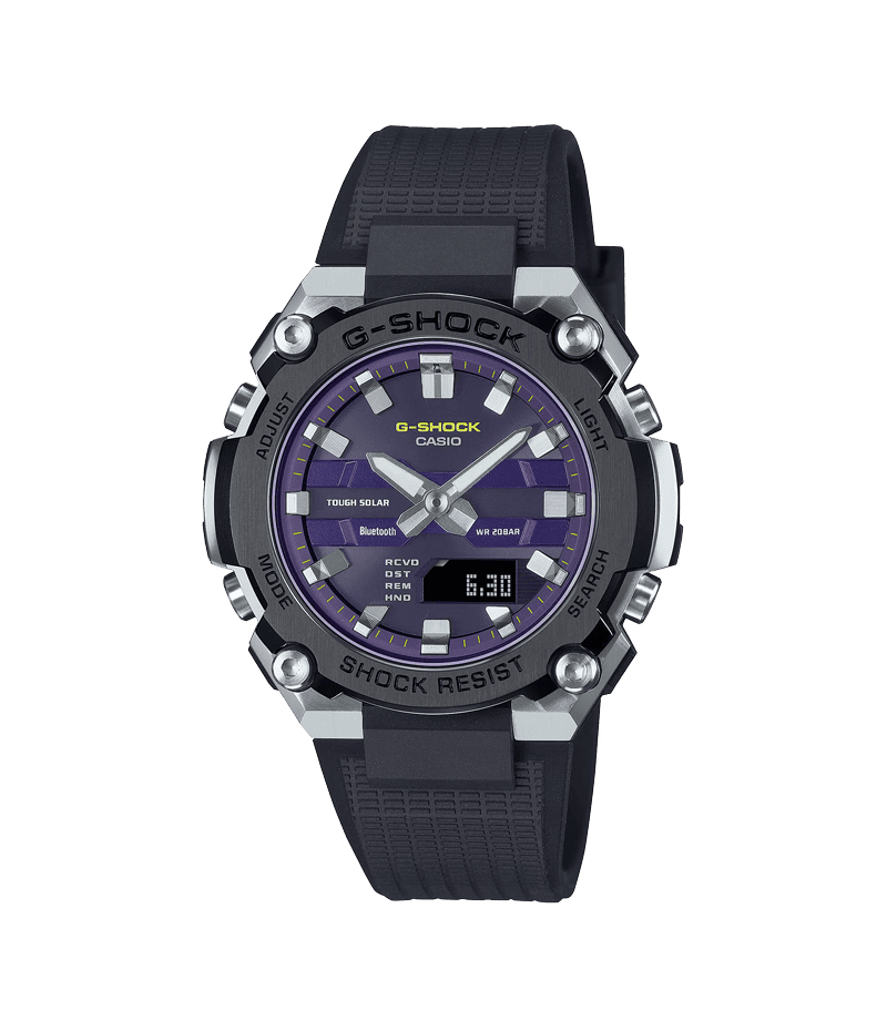 メタルのベゼルにパープルの文字板、プラスチックバンドと、カジュアルシーンでもビジネスシーンでも幅広く活用できるデザインに仕上げました。 タフネスとデザイン性を両立した、G-STEELシリーズで、幅広くご利用いただけるクールなデザインとなっております。