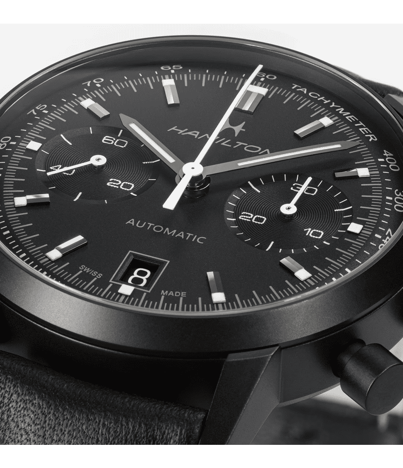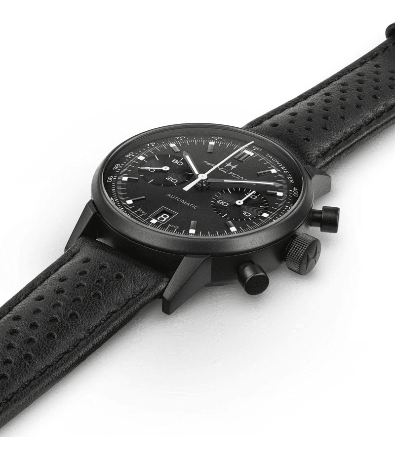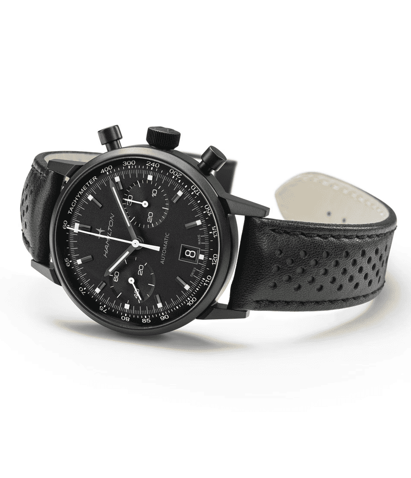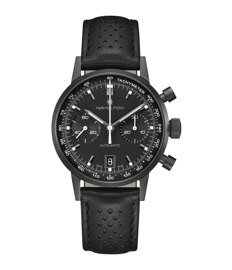 ヴィンテージクラシックにモダンな解釈を加え、40mmのオールブラック PVDケース、ダイヤル、パンチング加工を施したストラップが、70年代を思い起こさせる歴史的なモデルにコンテンポラリーなアクセントを添えます。