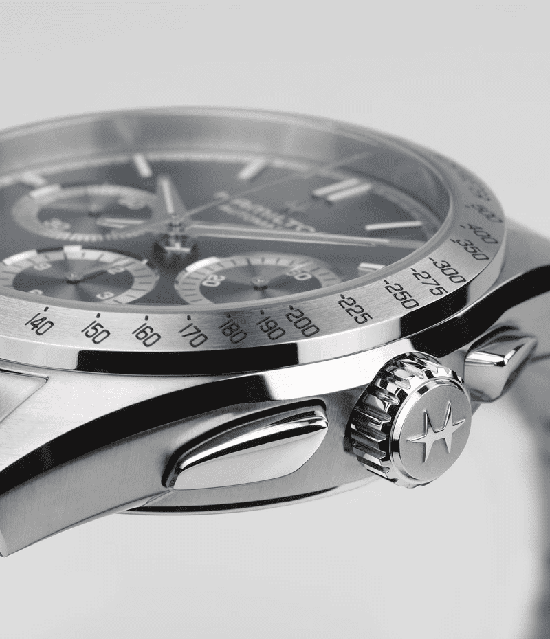 標準持続時間60時間を備えたH-31自動巻きクロノグラフムーブメントを搭載した「ジャズマスター パフォーマー オートクロノ」は、42mmのステンレススチール製ケースに、洗練されたライトブルーダイヤルと存在感のあるステンレススチール製ブレスレットが組み合わされています。
