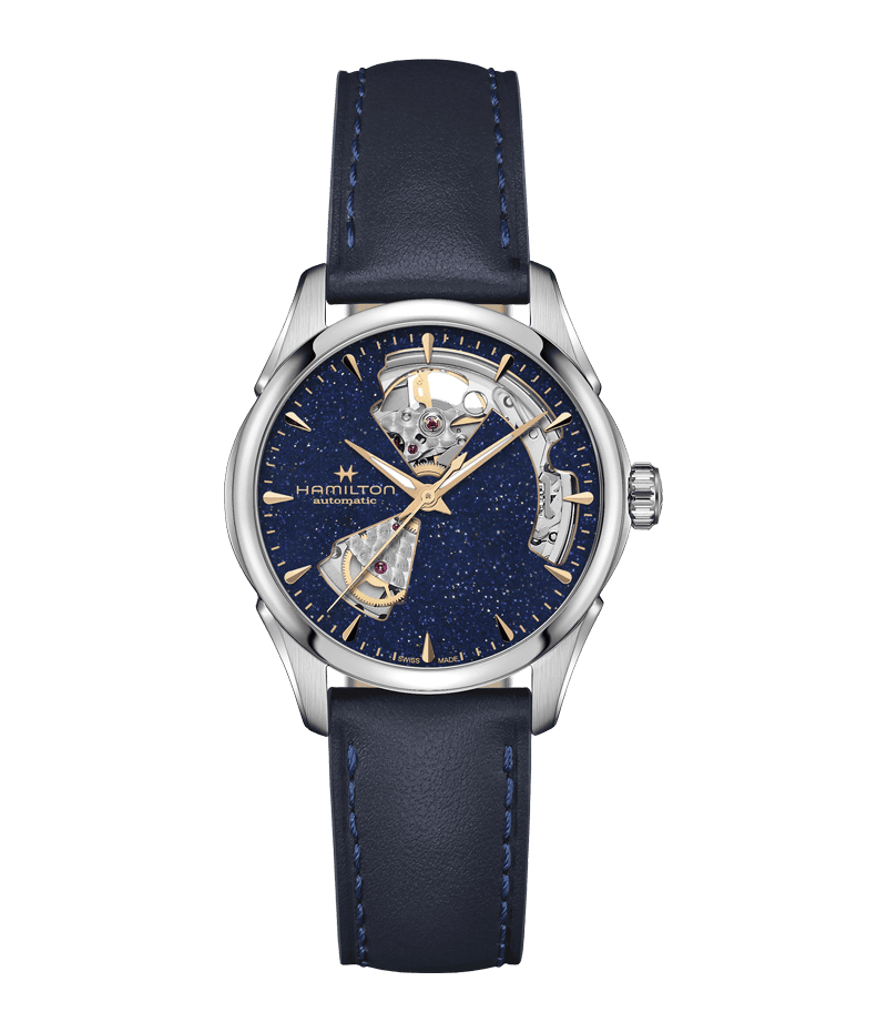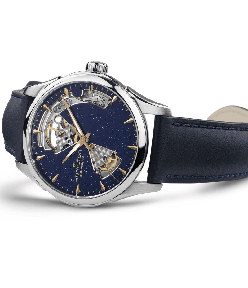 パワフルな内部機構を堪能できる「ジャズマスター オープンハート」。その精巧さが周りの視線を釘付けにします。魅力的なミッドナイトブルーのダイヤルが輝き、アイキャッチなタイムピース。都会的な設計が放つ現代性と、無限の宇宙を表現したカラーが融合したモデルです。