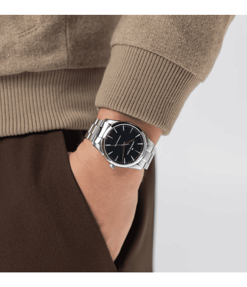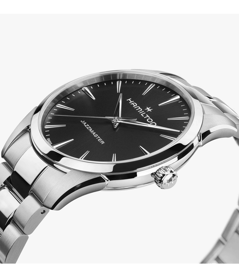 上品で多用途な「ジャズマスター クォーツ 40mm」は、モダンなシルエットにタイムレスな洗練さを宿しています。超薄型ケースのサテンとポリッシュ仕上げがミニマルなデザインを際立たせ、スケルトン加工の針がモダンなアクセントを添えています。自然な佇まいに気品を添える定番です。