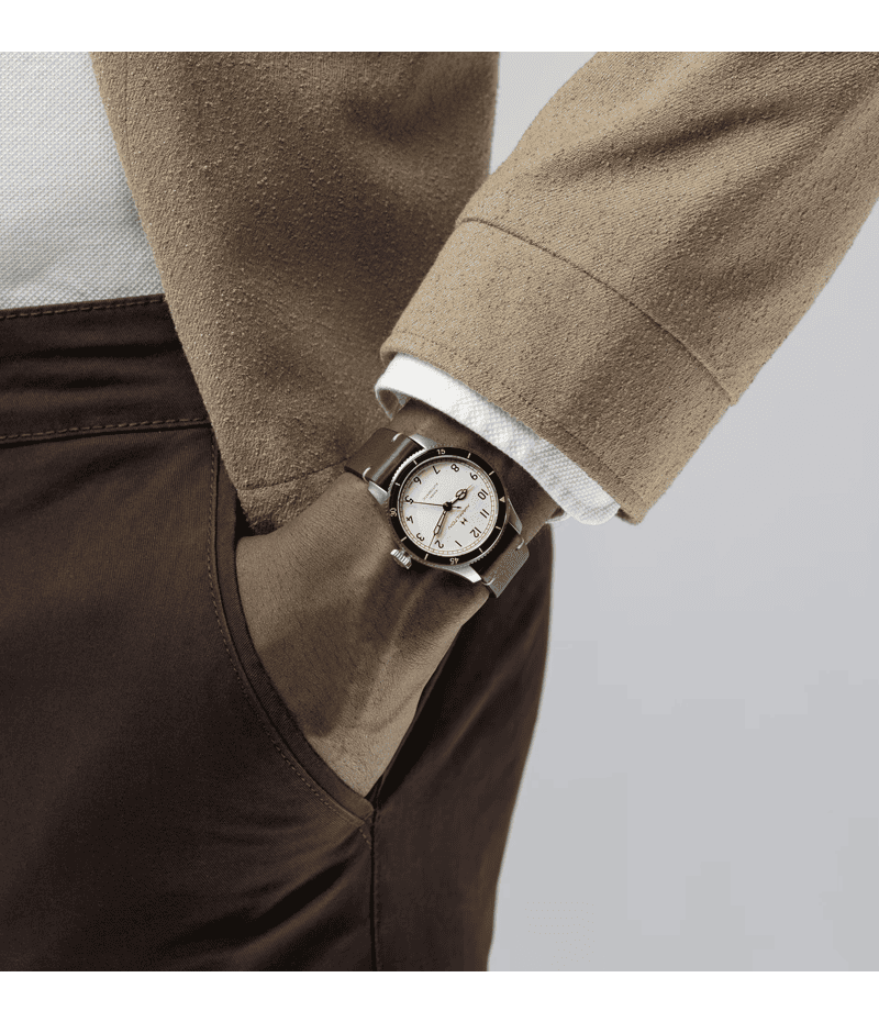 モスグリーンの輝きを放ち、カラー仕上げの回転ベゼルを備えたモデルは、H-10ムーブメントを搭載し、標準持続時間80時間を誇ります。エッグシェルホワイトのダイヤルとグリーンのレザーベルトが特徴の、流行に左右されないタイムピースです。