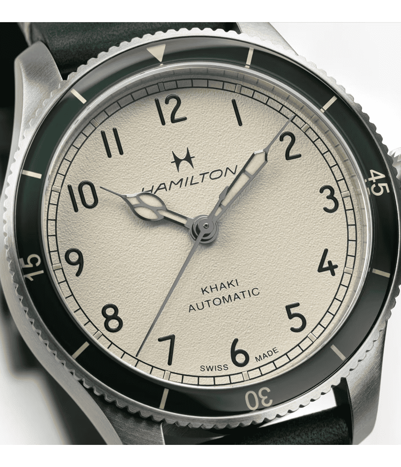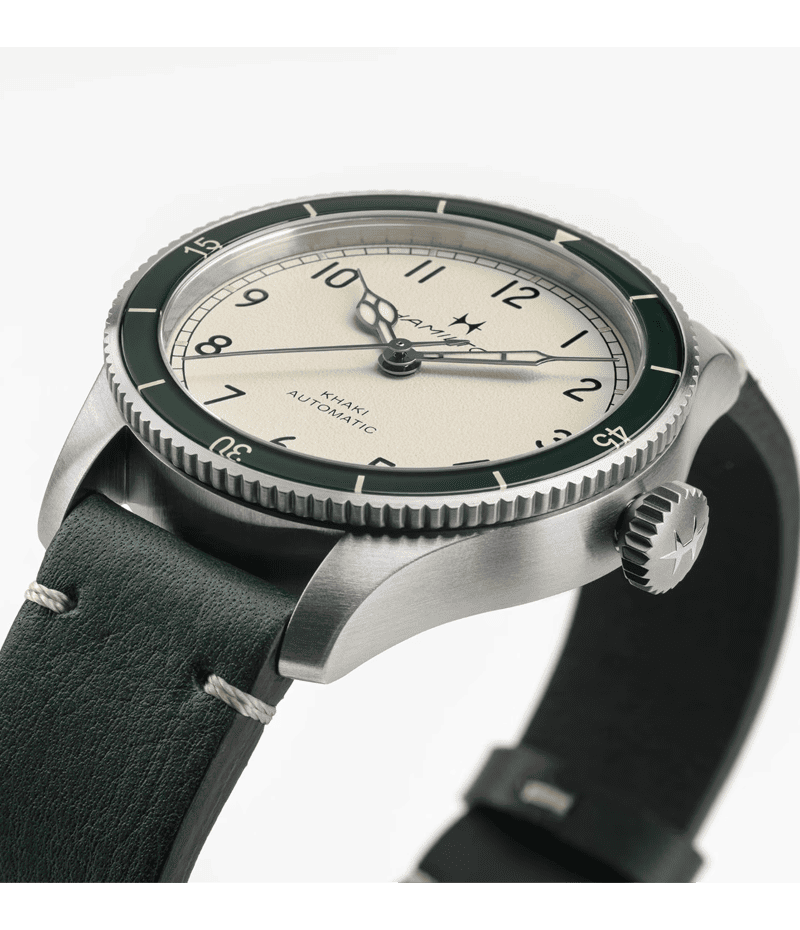 レトロな魅力が際立つ「カーキ パイロット パイオニア オート 38mm」は、ハミルトンのアビエーションとミリタリーの豊かな歴史にオマージュを捧げ続けています。