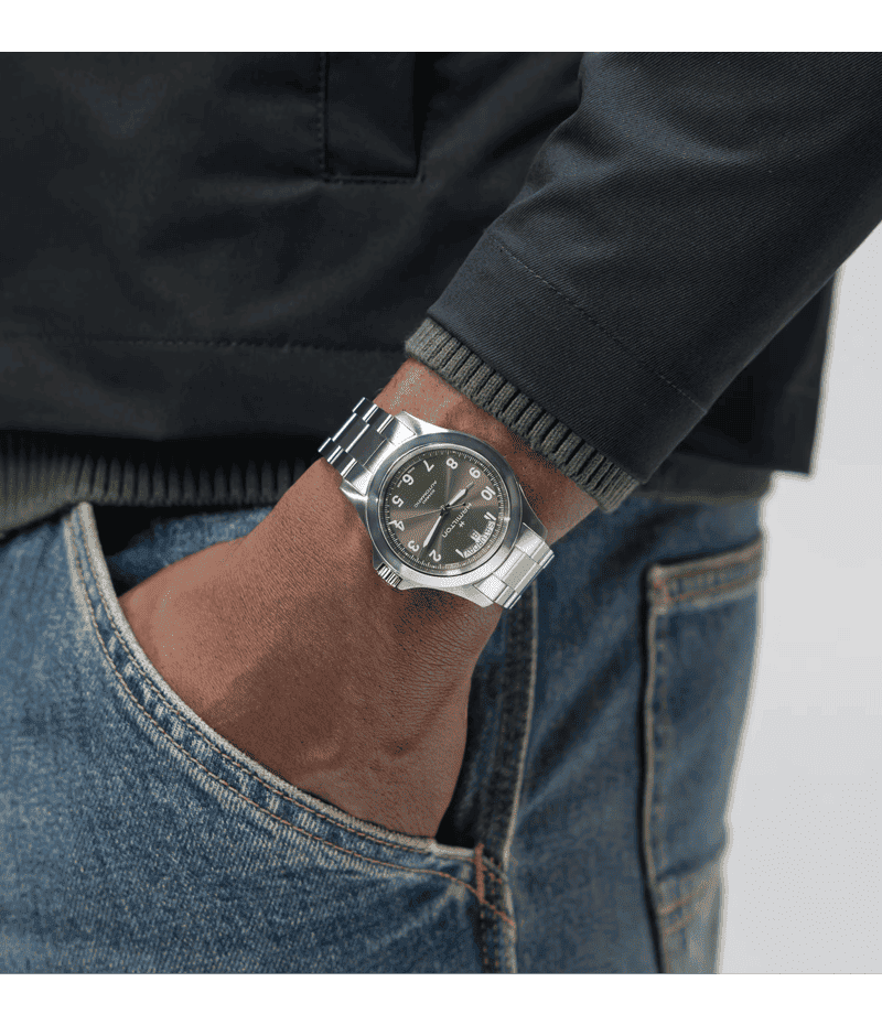 ラギッドでありながら洗練された「カーキ フィールド キング デイデイト オート 40mm」は、ミリタリーアイコンをオフタイムのために再解釈したモデルです。