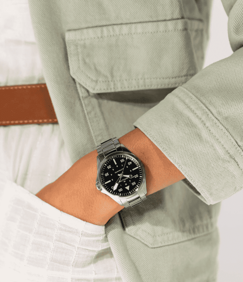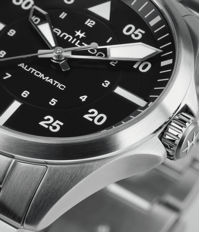 空の世界を真に愛する方のために製作された「カーキ パイロット」。探検の精神と「カーキ」の冒険を呼び起こします。標準持続時間80時間のH-10自動巻きムーブメントを搭載し、Nivachron™製ヒゲゼンマイを採用しています。サテン仕上げとポリッシュ仕上げを施したステンレススチール製ブレスレットを備えた「カーキ パイロット 39mm」には、オールブラックのダイヤルを合わせています。