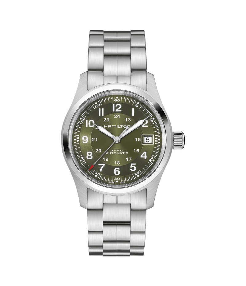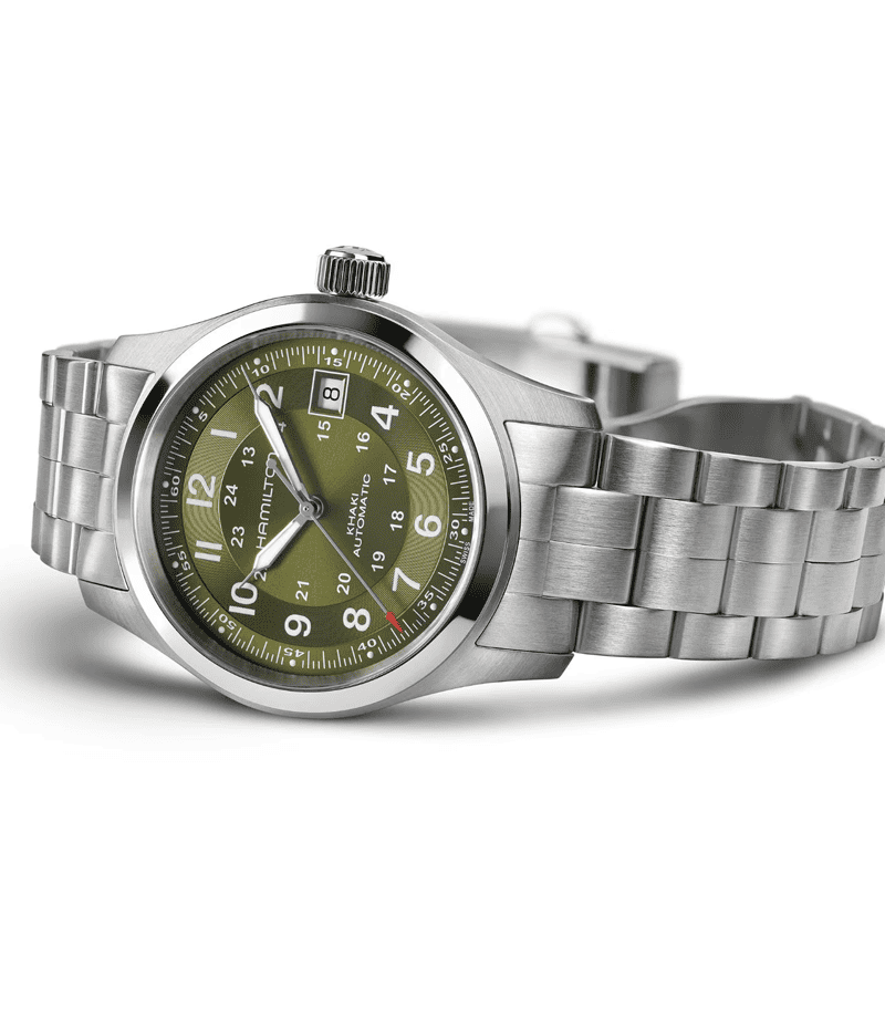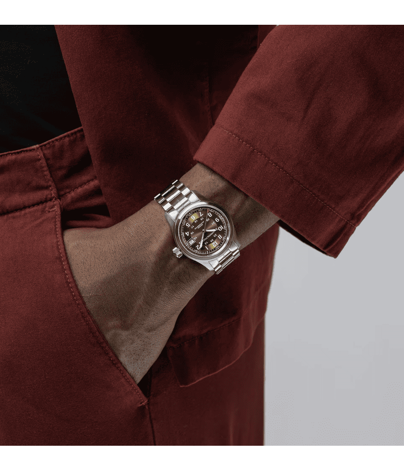 オリジンにインスパイアされた「カーキ フィールド オート」では、ミリタリーウォッチと歩んできた歴史とコンテンポラリーなデザインが融合。現代のパイオニアにとって汎用性の高いモデルです。