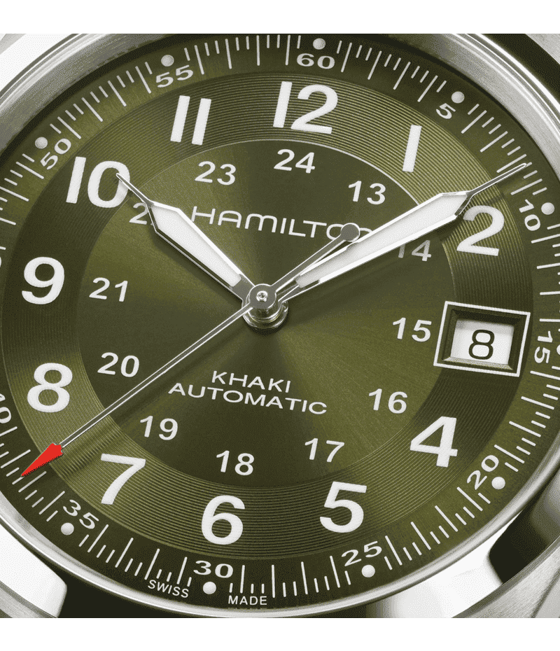 グリーンのサンレイダイヤルとスネイル加工のアワーリングの組み合わせは光を反射し、テクスチャーや深みを強調します。冒険を活動的に思う存分楽しむために開発された自動巻きムーブメントH-10は、標準持続時間80時間を実現。あなたを満足させることでしょう。
