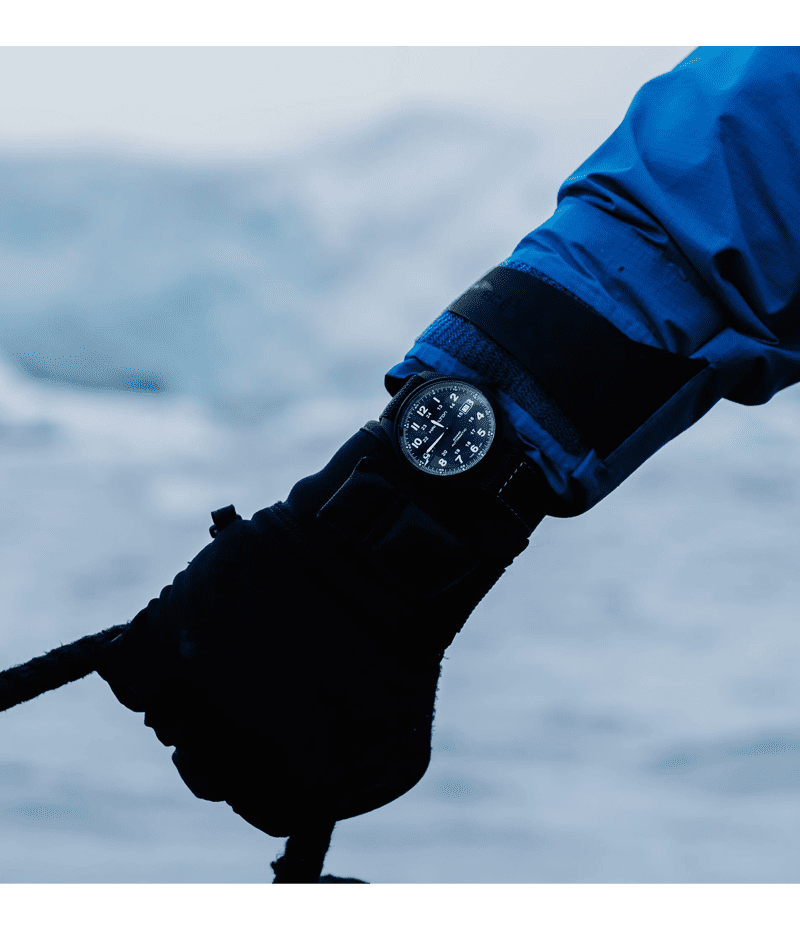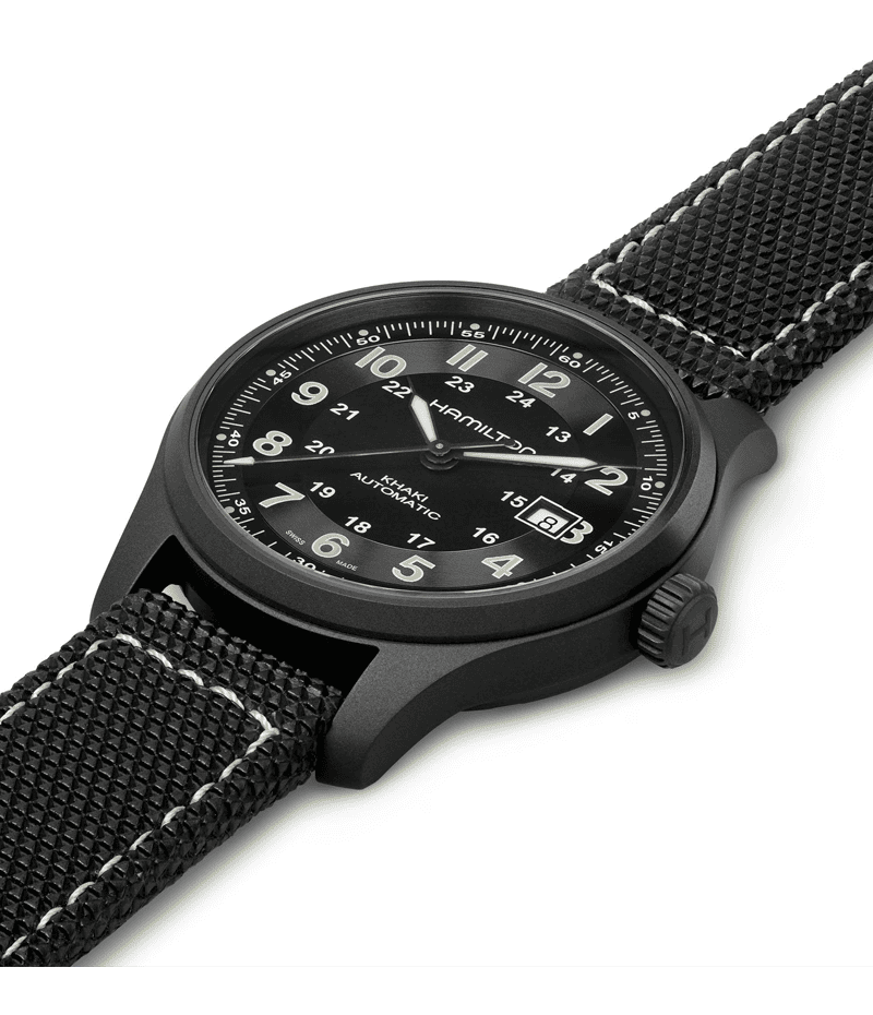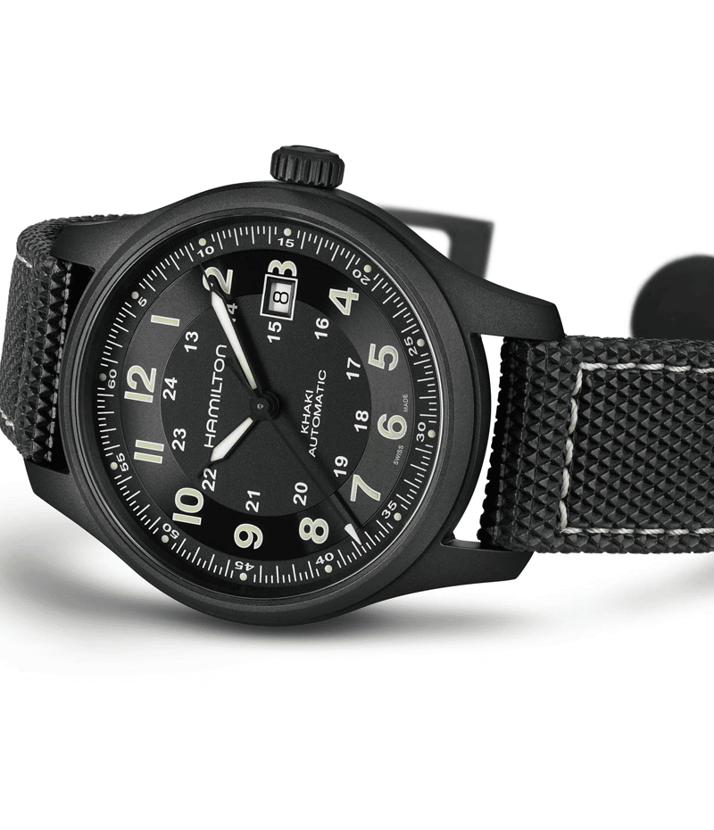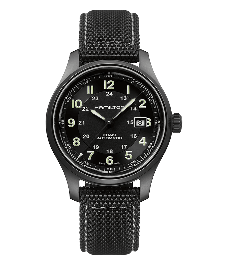 軽量のチタン製でありながら、重量級の機能を備えたカーキ チタニウム オート。シンプルなダイヤルとラバーストラップは、使命感溢れる男性にふさわしいタイムピースです。