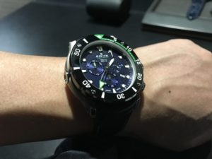 鮮やかなイエローラバーストラップや、サテン仕上げの46mmのチタン製ケースは、重厚なイエローの潜水艦を連想させます。