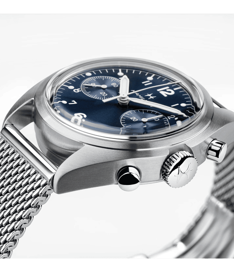 独自の手巻きムーブメントH-51-Siを搭載したこのタイムピースは、標準持続時間60時間と、サンレイ仕上げの見事なアビエーションブルーのダイヤルを誇ります。