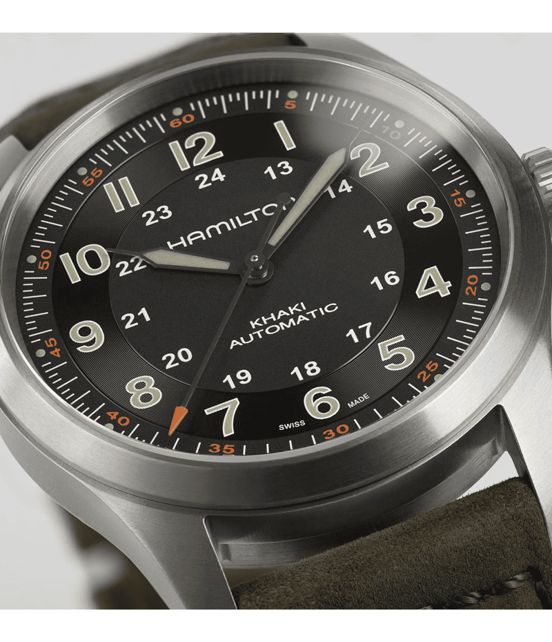 軽量な素材を組み合わせた「カーキ フィールド チタニウム オート」は、現代のヒーローにふさわしい究極の万能時計です。まさにフィールドでの活動にふさわしい38mmのケースは、オリジナルモデルに忠実なデザインで、快適性や順応性が際立ちます。