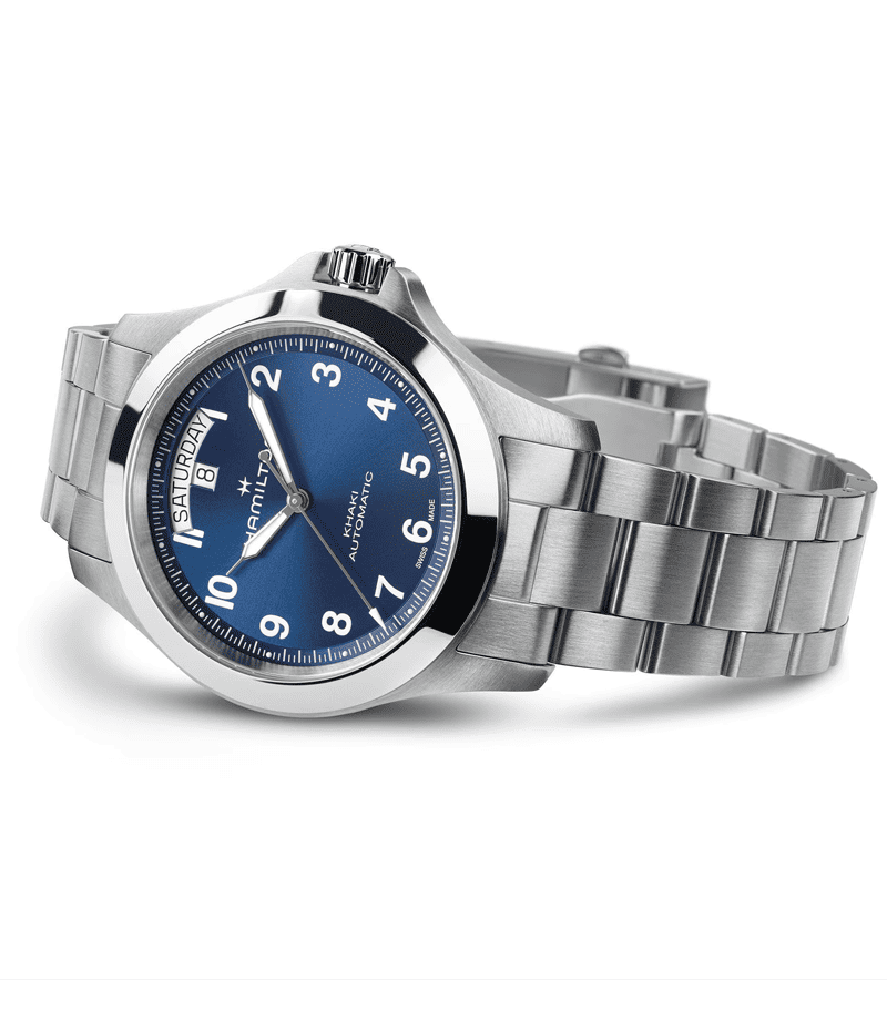 ラギッドでありながら洗練された「カーキ フィールド キング デイデイト オート 40mm」は、ミリタリーアイコンをオフタイムのために再解釈したモデルです。