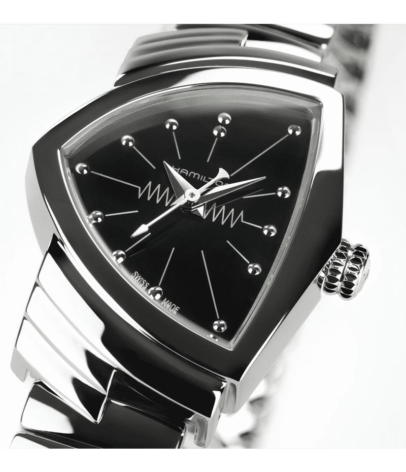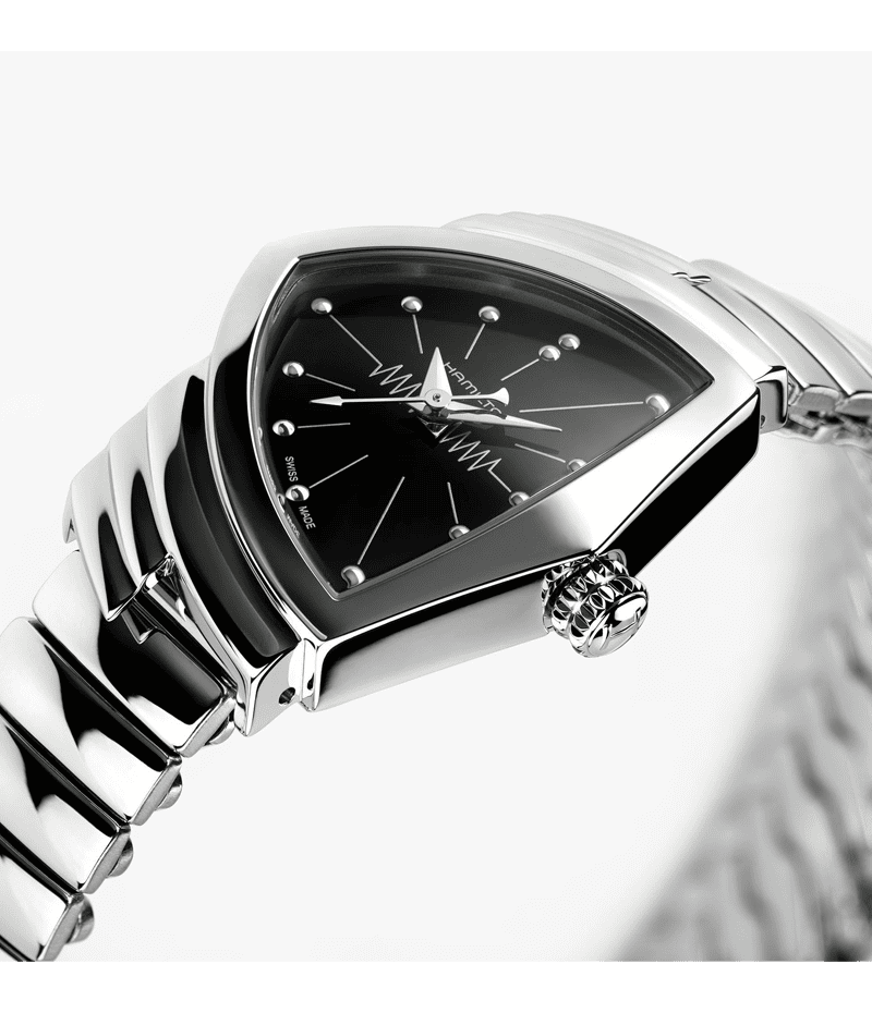 「ベンチュラ S クォーツ」は、エルヴィスへのオマージュを込めたフレキシブルなブレスレットを採用し、ミッドセンチュリーモダンにロックのスピリットが息づくデザインに仕上げられています。