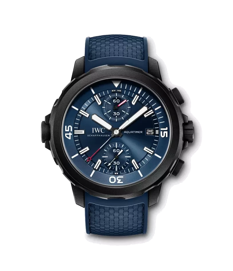 フライバック機能付きクロノグラフ・ムーブメントであるIWC自社製「キャリバー89365」を搭載し、12時位置のサブダイヤルに、経過時間を分単位で表示します。また、アウター/インナーベゼルにより、潜水時間を安全に設定することができます。