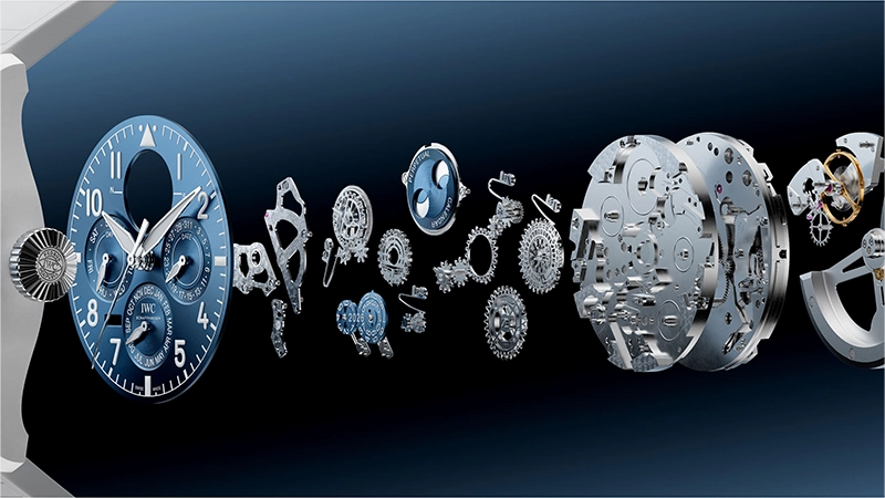 このカレンダーは、日付、曜日、月、ムーンフェイズを4つのサブダイヤルに表示します。特徴的な4桁の年表示は、7時位置と8時位置の間に配されています。ムーンフェイズを駆動する輪列も新たに設計され、1040年でわずか1日という高い精度を実現しています。IWCを象徴するダブルムーン®表示は、北半球と南半球の両方から見た月の姿を映し出します。