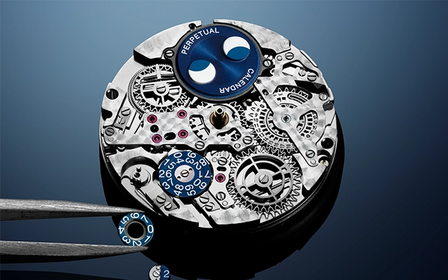 「パーペチュアル・カレンダー・プロセット」は、リューズの1つのポジションだけで前方向にも後方向にも調整できる初のムーンフェイズ付き永久カレンダーで、時刻合わせと同じように簡単かつ直感的にカレンダー修正を行えます。これを可能にしているのが、歯車だけを用いた全く新しいモジュール構造で、5件の特許によって保護されています。多くの部品は非常に複雑な形状を備えており、リソグラフィーと電鋳を組み合わせた高精度の微細構造形成技術であるLIGAプロセスによって製造されています。