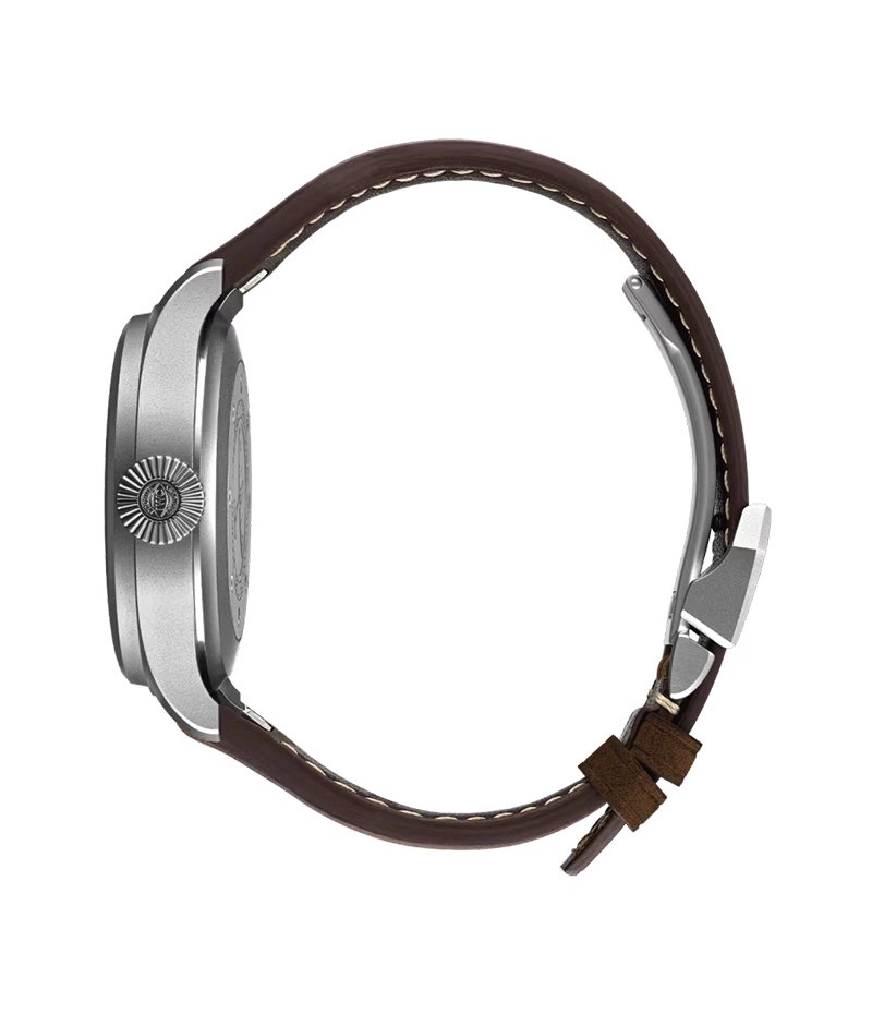 ブラックの文字盤のデザインは、歴史的な飛行監視要員用時計からインスピレーションを得たものです。アウターリングには分と秒のみがホワイトでプリントされ、時はインナーサークルの上に控えめなグレーでやや小さくプリントされています。このレイアウトにより、パイロットと航空士は文字盤を一目見るだけで、分および秒を容易に読み取ることができます。
