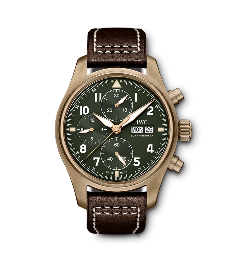 ブロンズ製ケース、オリーブグリーンの文字盤、ブラウンのカーフスキン・ストラップが個性的なクロノグラフです。ご使用の状況に応じて、パイロット・ウォッチ・クロノグラフ・スピットファイアを特徴づけるブロンズならではの「パティナ」(緑青)が生じ、その色は時を経るにつれて濃くなっていきます。