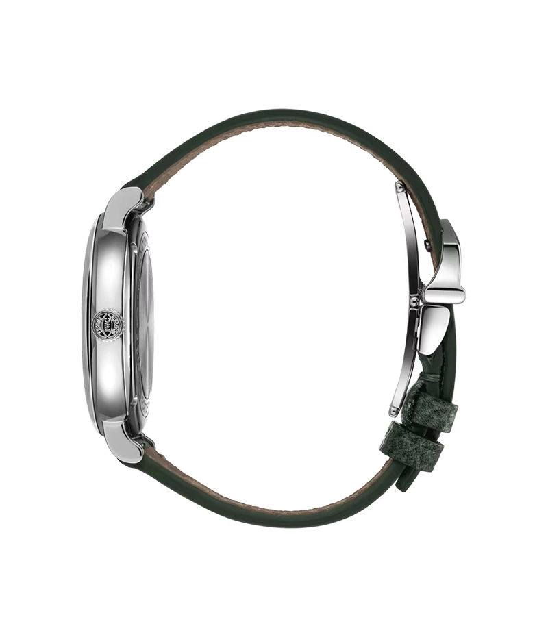 ケースはステンレススチール製で、ロジウムコーティングのインデックス、6時位置と12時位置のローマ数字、スレンダーなリーフ針が、深いグリーンの文字盤と美しいコントラストを成しています。文字盤の上では、12個のホワイトダイヤモンドがアワーマーカーとして煌めきを放ちます。