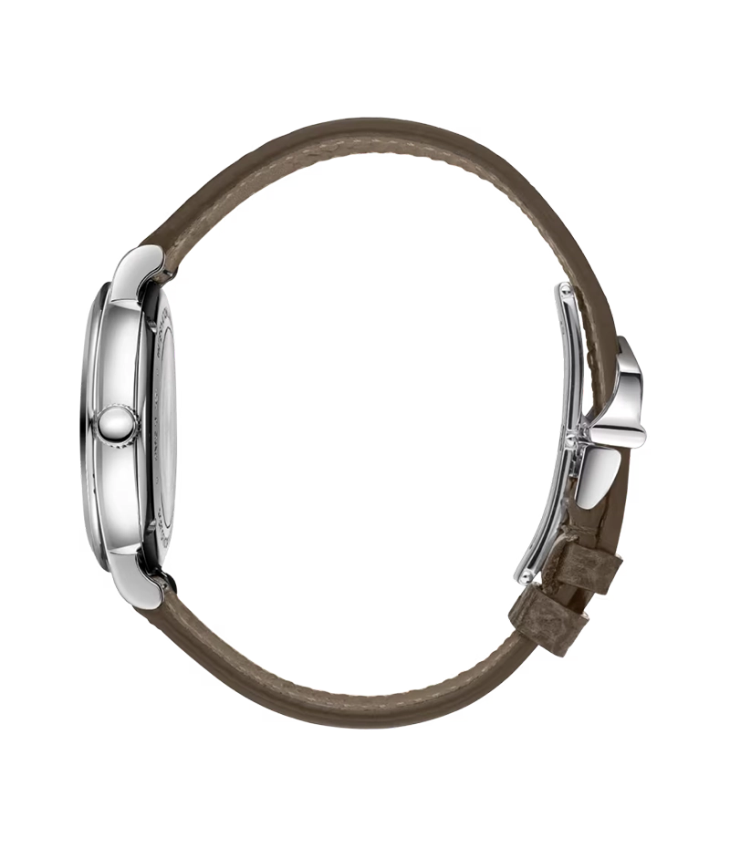 このタイムピースには、トープのカーフスキン・ストラップとバタフライ・フォールディング・クラスプが取り付けられています。ストラップはナチュラルで柔らかな仕上がりで、現代的で高級感のある雰囲気を誇ります。統合された「クイックチェンジシステム」のおかげで、簡単に交換できます。